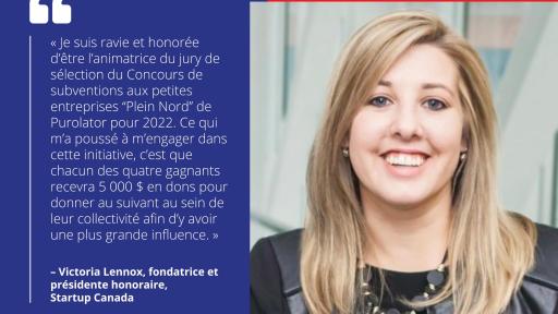 « Je suis heureuse et honorée d’être la modératrice du comité de sélection pour le Concours de subventions aux petites entreprises "Plein Nord" 2022 de Purolator », déclare Victoria Lennox, fondatrice et présidente émérite de Startup Canada. « Les initiatives comme les subventions offertes par Purolator sont très importantes pour faire grandir les ambitions des petites entreprises au pays. J’ai été motivée à contribuer en raison du prix « Donner au suivant » de 5 000 $ que chacun des quatre gagnants pourra distribuer dans sa collectivité et ainsi avoir un plus grand impact. Ce programme comprend vraiment les valeurs des entrepreneurs et leur volonté de faire une différence dans leur collectivité par l’entremise de leurs activités. »