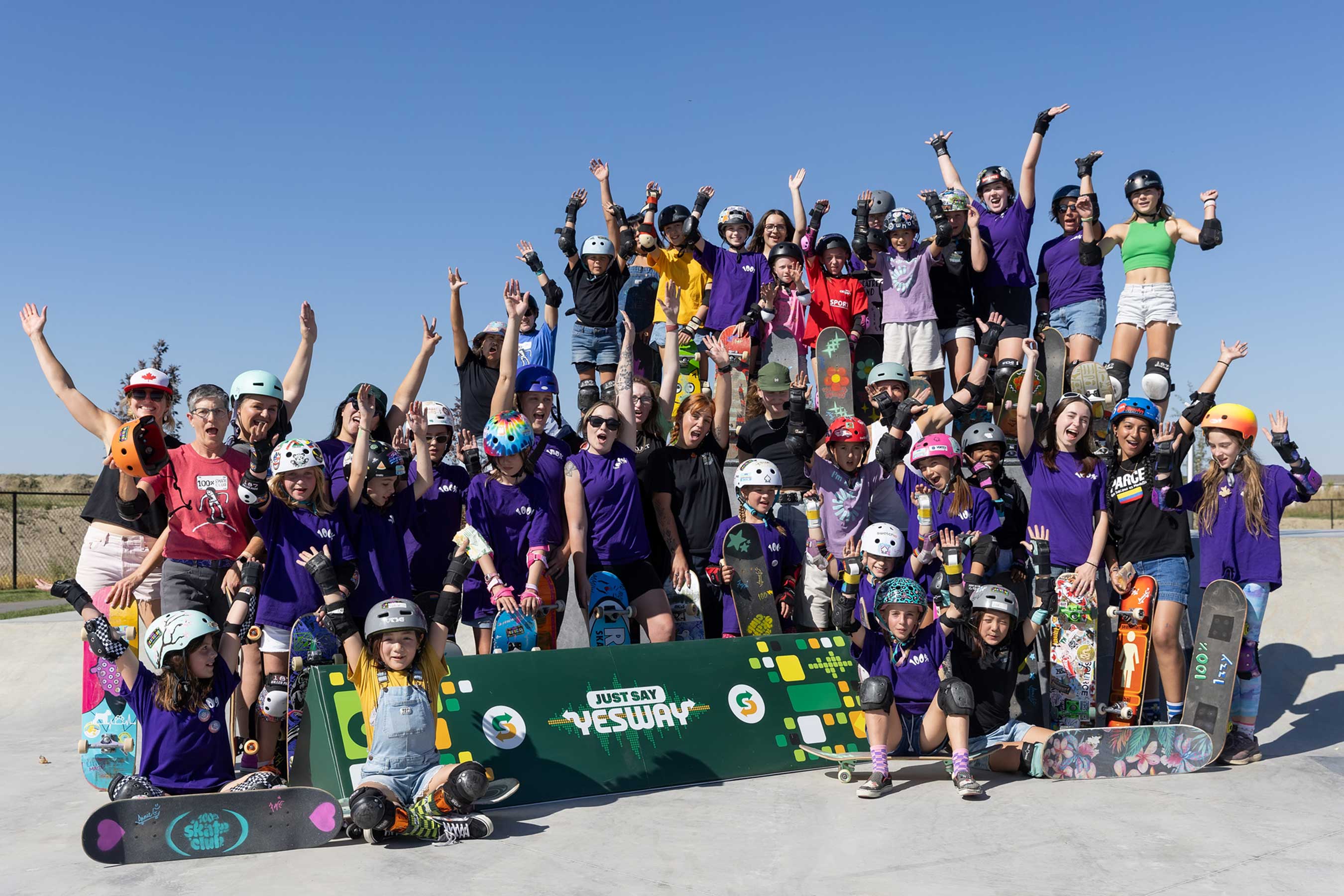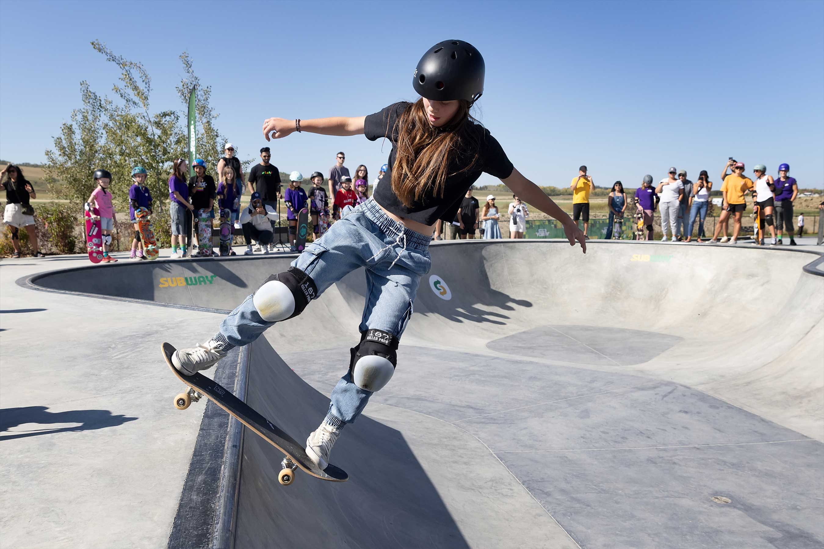 À Calgary, Fay De Fazio Ebert (la plus jeune ambassadrice de Subway Canada et planchiste de compétition âgée de seulement 13 ans) et l’olympienne Annie Guglia ont surpris le 100% Skate Club (une organisation de planche à roulettes pour les filles, les femmes et les personnes non binaires de Calgary) avec une compétition de figures pendant laquelle Fay a pu montrer ses figures en hauteur signature.