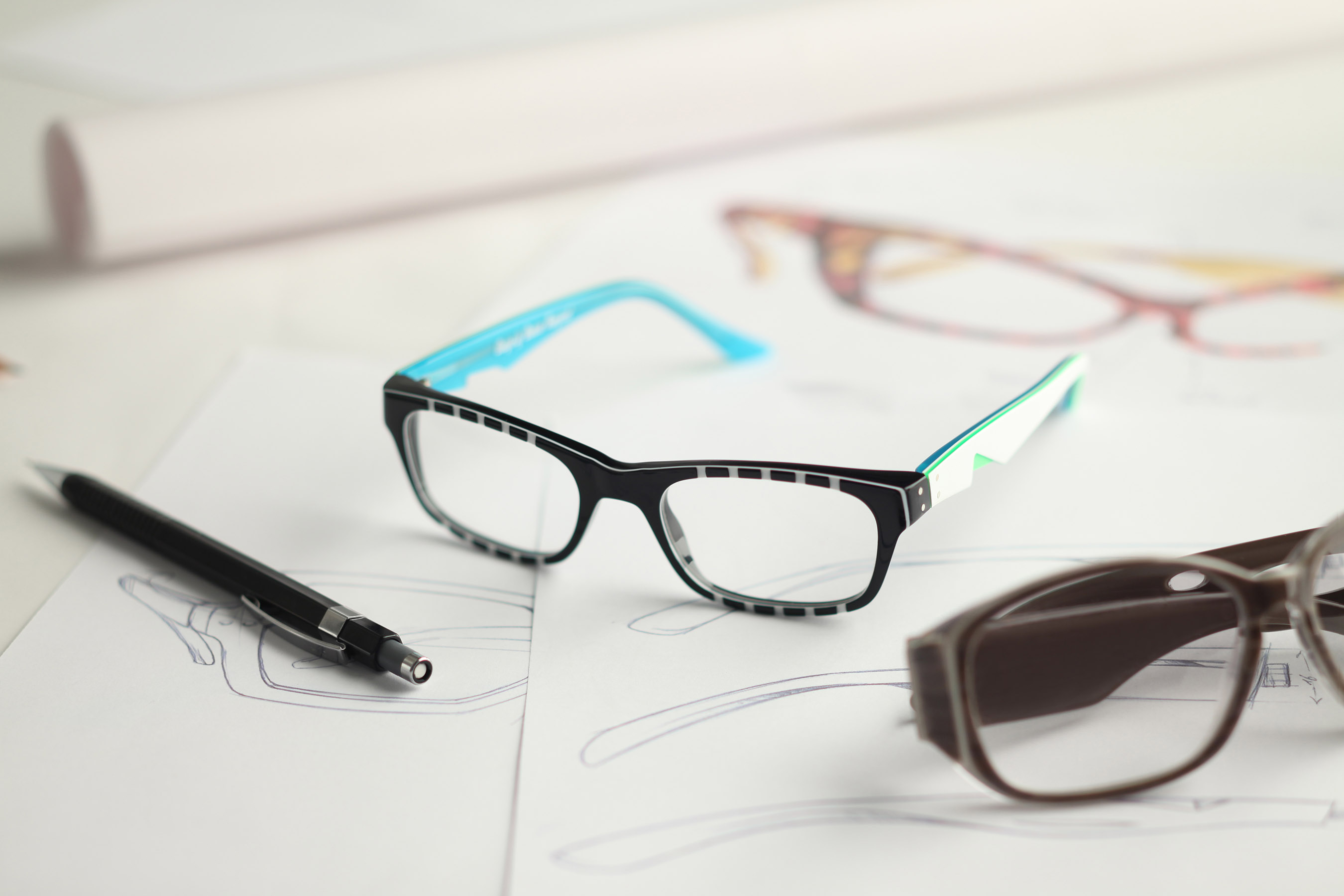 Lors du premier rendez-vous, l’opticien reçoit et échange avec le client afin de cerner ses attentes. Le designer réalise ensuite une esquisse de la forme des lunettes souhaitée et l’adresse au client. Modèle sage ou extravagant, coloris classique ou punchy, tout est possible grâce à la palette infinie de couleurs de plaque d’acétate disponible.