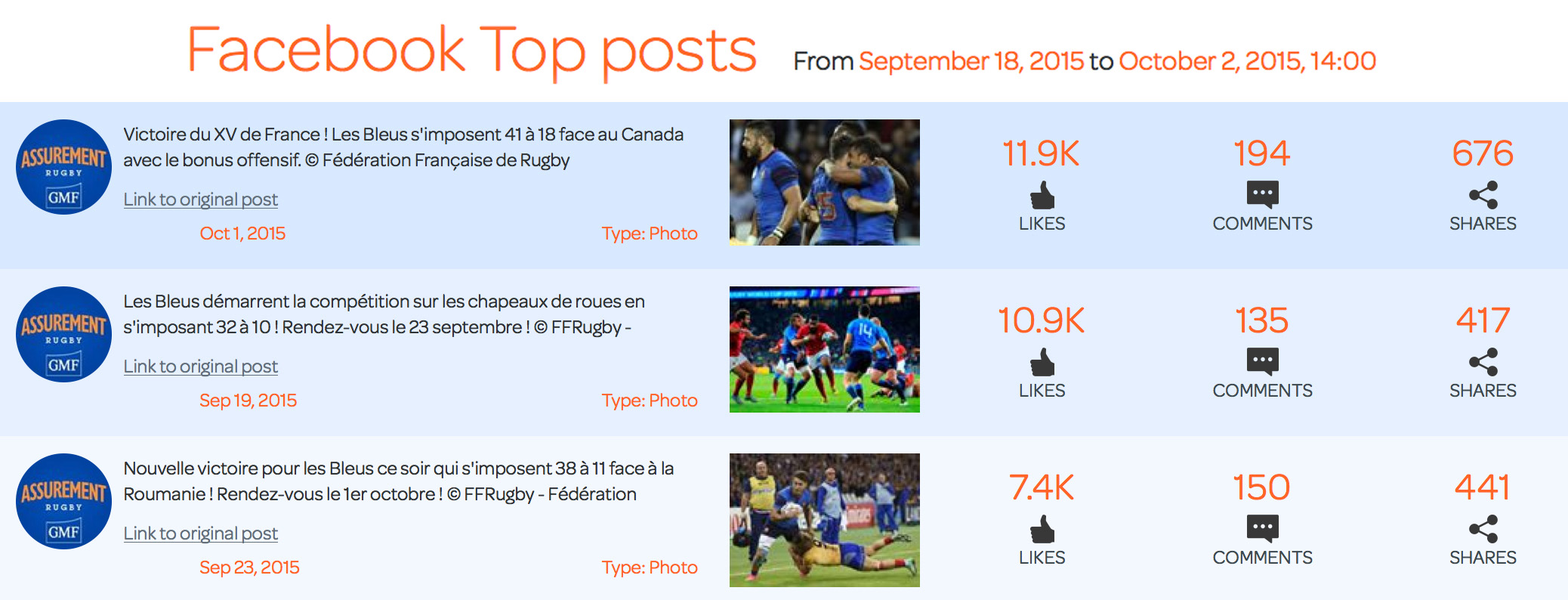 Sur Facebook, la page Assurément Rugby de la GMF détient le meilleur score de performance eValue sur la période (80.80/100), notamment grâce à une excellente ligne éditoriale, représentée par un score d’Engagement de 97,20/100. Le score eValue représente l’efficacité d’une stratégie de marque sur les réseaux sociaux : sa capacité à engager, répondre et être visible dans les fils d’actualité. Les posts relatifs aux victoires du XV de France lors de leurs trois premiers matchs (les 19, 23 septembre et le 1er octobre) sont les publications les plus likées, commentées et partagées du sponsor. Des journées cruciales pour l’équipe qui le sont donc tout autant pour les marques.