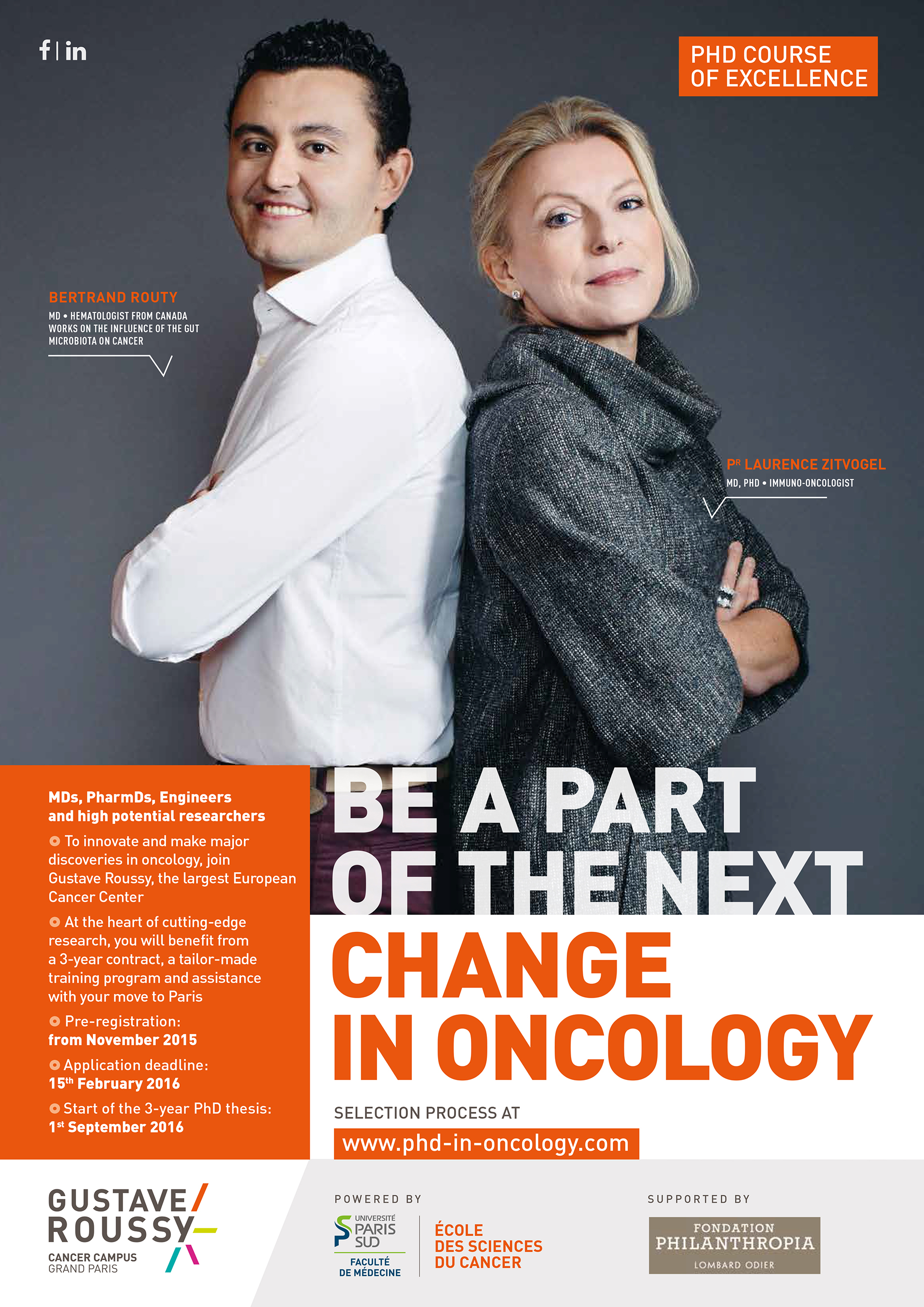 Créé au sein de l’Ecole des Sciences du Cancer intégrée au Collège des écoles doctorales de l’Université Paris-Sud/Paris-Saclay, le programme « Parcours d’excellence en cancérologie – Fondation Philanthropia » va permettre à une quatrième promotion de quatre étudiants-chercheurs de se former à la cancérologie de demain. Convaincu qu’une recherche innovante et de haut niveau se mène dans une démarche d’échange international, Gustave Roussy mise sur un recrutement des candidats pour moitié hors de France. Tout sera mis en œuvre pour rechercher la parité hommes/femmes. La thèse pourra se dérouler en co-tutelle avec l’établissement d’origine du candidat et éventuellement en collaboration avec un autre centre d’excellence international.