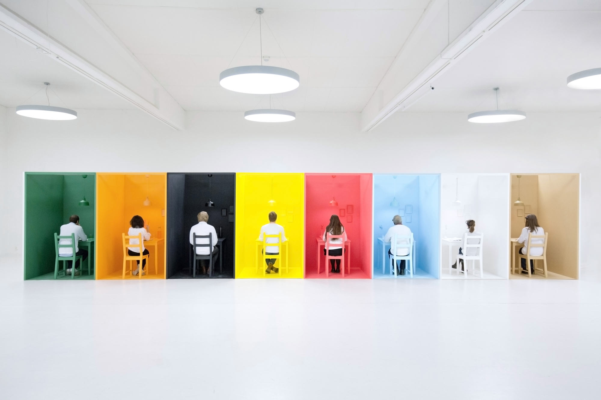Pour comprendre comment les couleurs affectent l’expérience des clients dans un restaurant, Tork a équipé 16 personnes de casques analysant leurs ondes cérébrales dans 8 environnements monochromes. Dans chacun de ces environnements, décors, murs, sols, meubles et vaisselles étaient exactement du même pantone.
