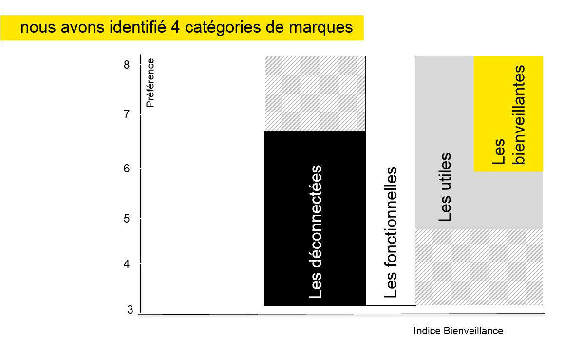 En corrélant ces 2 indices (préférence et bienveillance), on peut distinguer, 4 types de marques :