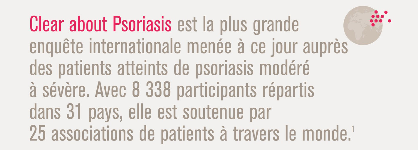 Entre octobre 2015 et mars 2016, Novartis, soutenu par plusieurs associations de patients dans le monde, dont l’association France Psoriasis en France, a mené une enquête impliquant 8 338 patients de 31 pays, dont 616 patients français.