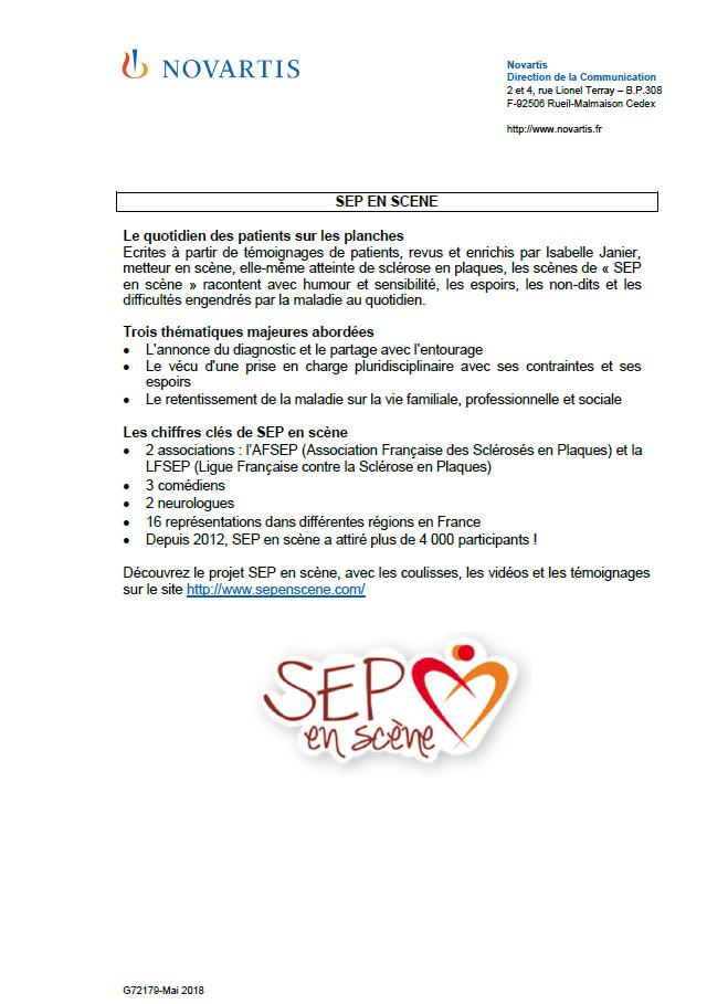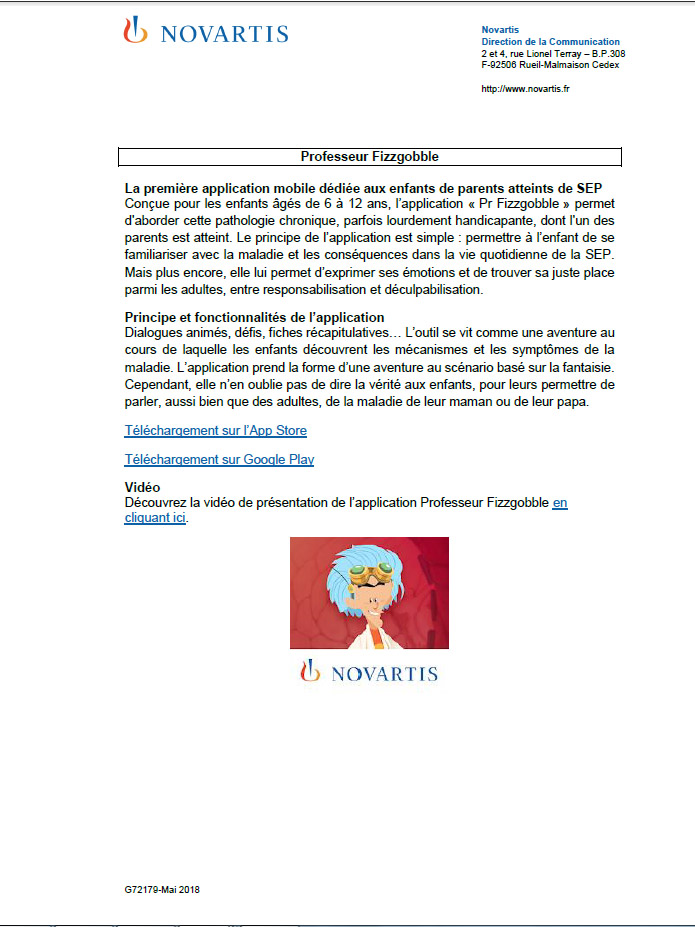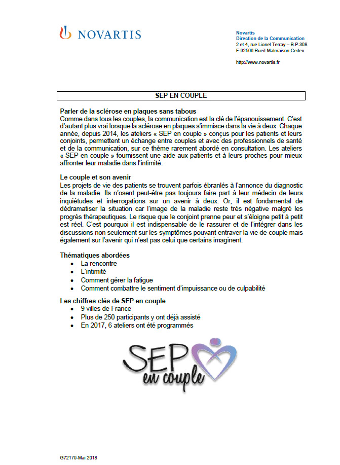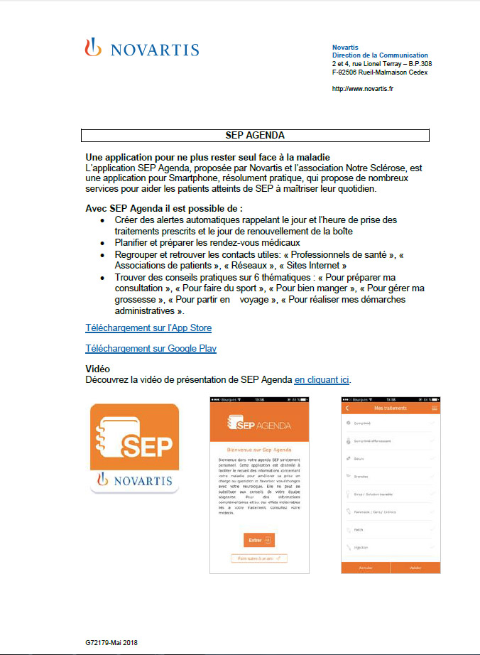 - Avec ce dispositif d'information innovant et différenciant, Novartis poursuit son engagement auprès des patients atteints de sclérose en plaques et de leurs proches et complète ainsi sa liste d’outils mis à disposition depuis plus de 5 ans.