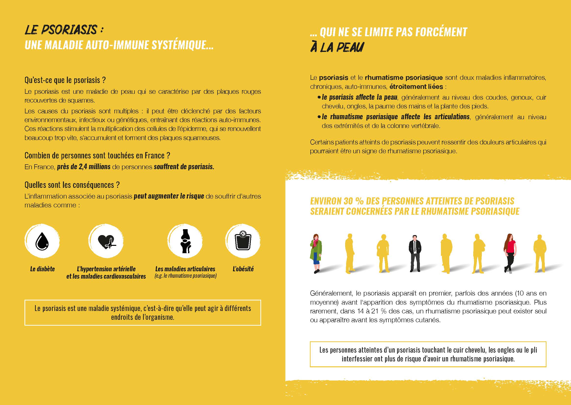 - Un axe de sensibilisation et d’information avec des outils pédagogiques destinés aux patients atteints de psoriasis et leurs proches : 5 affiches, une brochure, une vidéo didactique sur la maladie ainsi que des témoignages.