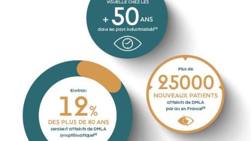 La DMLA désigne en réalité un stade tardif de la maculopathie liée à l’âge (MLA) [3]. Souvent asymptomatique, la MLA peut rester stable tout au long de la vie du patient mais dans certains cas, elle évolue en forme dégénérative tardive [5], atrophique ou humide [3], avec une prévalence qui devrait continuer de croître d'ici à 2040 [1] et qui affecte aujourd’hui plus de 25000 nouveaux patients par an en France [5]. On parle alors de DMLA de forme humide, ou exsudative quand il y a un épaississement de la rétine [3].