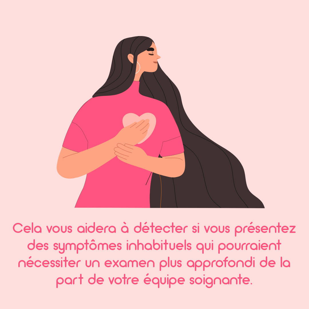 N'hésitez pas à contacter votre médecin si vous avez remarqué un changement nouveau et inhabituel au niveau de vos seins.