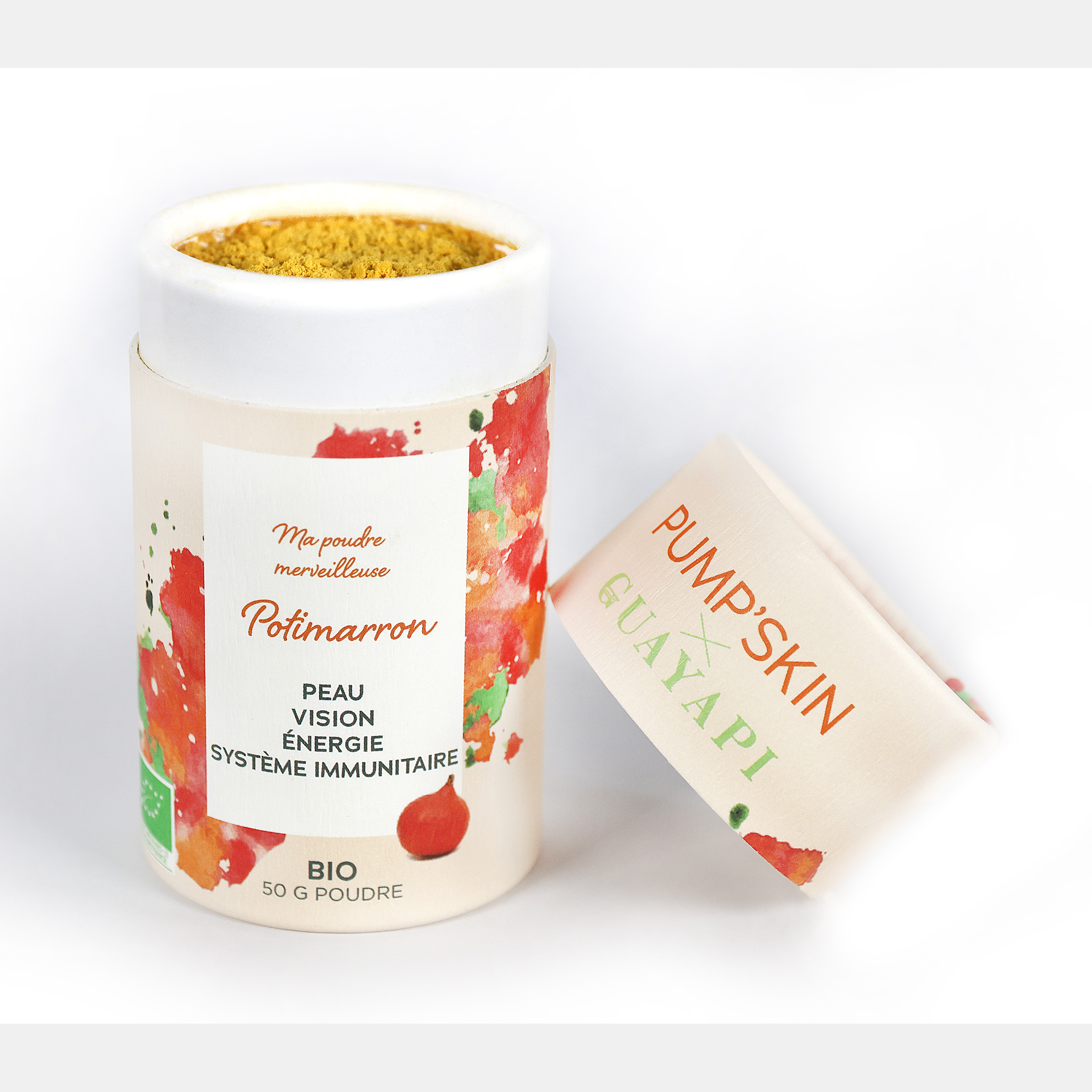 Paris, le 08 Avril 2024 - Pump'skin, marque de haute cosmétique Bio française pionnière à utiliser le potimarron doux Bio d'Hokkaïdo cru, entre dans l'univers de la nutricosmétique avec le lancement de "Ma poudre merveilleuse", en collaboration avec la marque française alimentaire Bio Guayapi qui valorise les ingrédients et leurs terres d’origine.