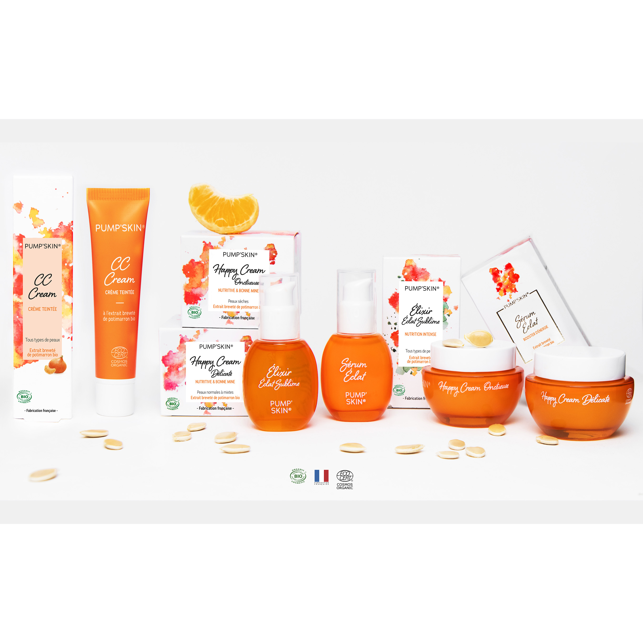 Le potimarron doux Bio d'Hokkaïdo, est issu d'une variété ancienne, cultivée dans le respect de la biodiversité par la ferme conservatoire de Sainte Marthe en Sologne. La ligne de haute cosmétique Bio au potimarron cru de Pump'skin se compose de cinq produits, conçus pour chaque type de peau, pour être appliqués sur la peau du visage et du cou, matin ou soir. Dans un geste éco-responsable, la marque a choisi de ne pas produire d'échantillons.