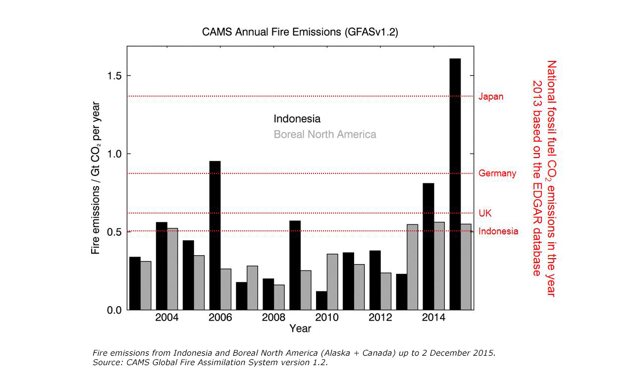 - Az indonéz tüzek kibocsátásai több CO2-t juttattak a légkörbe 2015. szeptemberében és októberében, mint például Japán, Németország vagy az Egyesült Királyság teljes ipari kibocsátása 2013-ban. Eddig körülbelül 0,3 gigatonna szén (illetve 1,2 gigatonna CO2) került a légkörbe 2015-ben, a kibocsátások 80%-a pedig szeptemberben és októberben, a fenti tűzesetek idején történtek.
