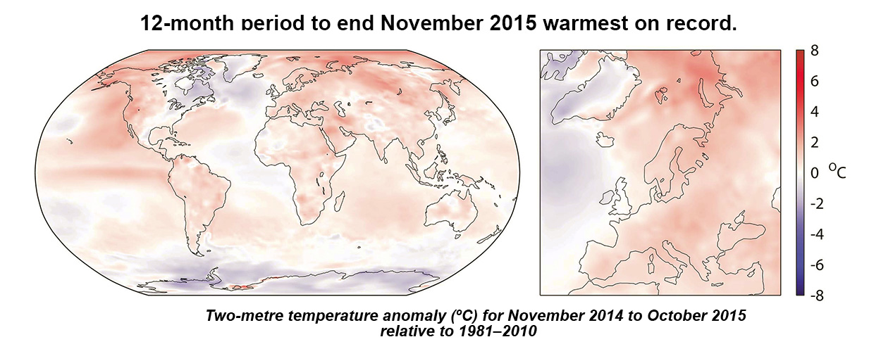 - A 2014. decemberétől 2015. novemberéig tartó időszak globális hőmérsékleti átlaga a nyilvántartott legmelegebb 12 havi érték volt, több mint 0,4 °C-kal magasabb, mint az 1981 és 2010 közötti 30 éves átlag.