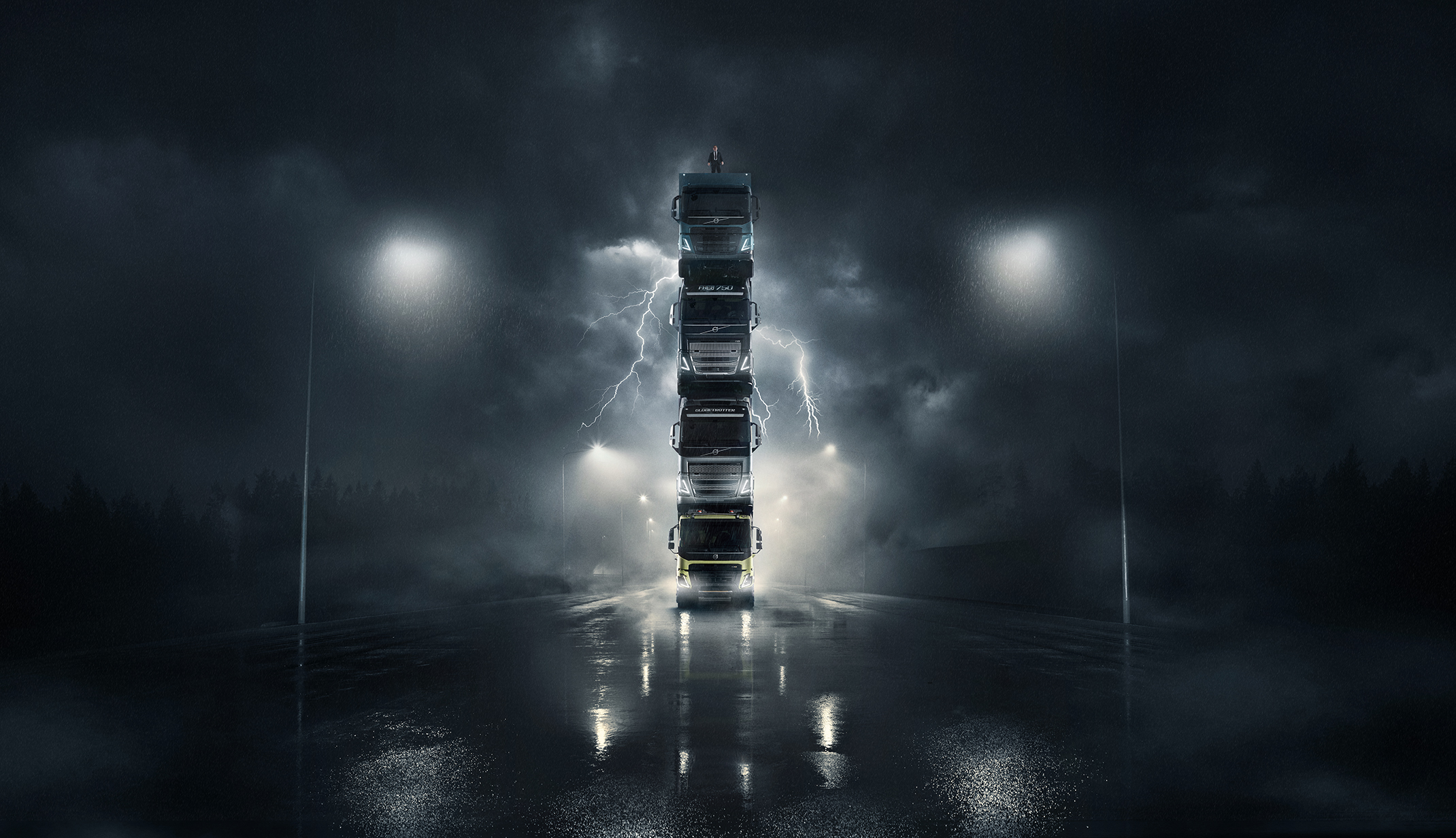 Volvo introduceert vier nieuwe trucks door ze op elkaar te stapelen in een spectaculaire film, compleet met de CEO erbovenop