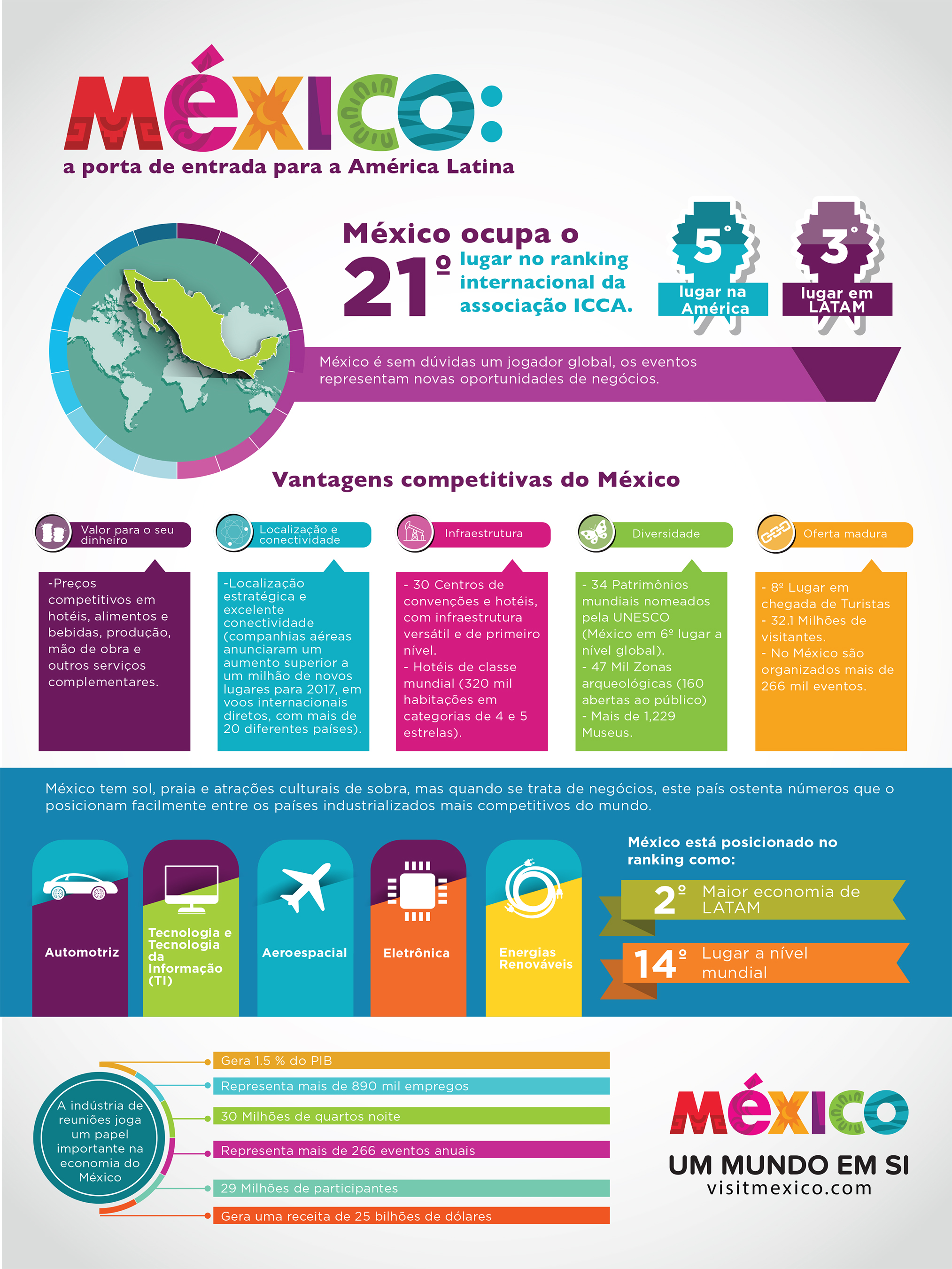 CIDADE DO MÉXICO, 20 de dezembro de 2017 -- O Mexico Tourism Board (MTB -- Conselho de Promoção Turística do México) relatou que seu programa de encontros e eventos de 2017 resultou em um crescimento significativo no setor de turismo, registrando um crescimento de 6,7% de janeiro a outubro, em comparação com o mesmo período de 2016. O México assumiu uma posição de liderança como destino para encontros e eventos com o relançamento de seu programa de parcerias estratégicas com organizações do setor de encontros e iniciativas que objetivam elevar sua classificação na ICCA, bem como aumentar o impacto econômico do setor de encontros e convenções na economia mexicana, que atualmente responde por US$ 25 bilhões. A Associação Internacional de Congressos e Convenções (ICCA -- International Congress and Convention Association) classifica o México em 3º lugar na América Latina, em 5º nas Américas e 21º no mundo em encontros e viagens de incentivo.