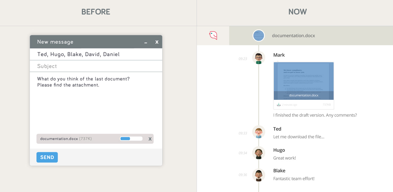 According to McKinsey Consulting Group, 28% of workers’ time is wasted on email, attachments, and information searches. Many companies attempt to fix this with other communication apps. But they all end up with similar inefficiency and poor productivity issues.