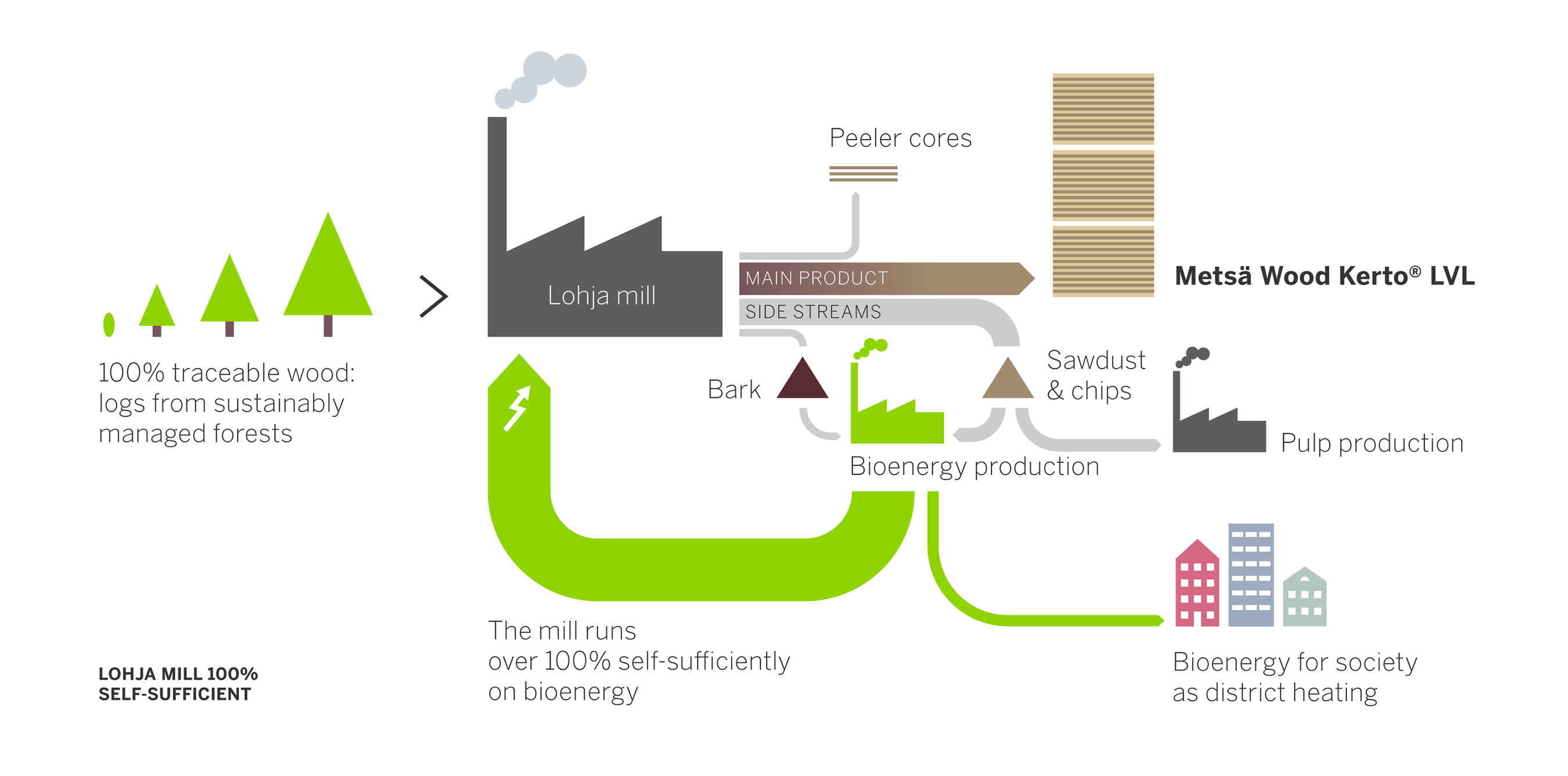 The Metsä Wood mill in Lohja is a great example of the joint production of construction products and bioenergy. First, as much of the wood as possible is used for Kerto LVL. Part of the sawdust and wood chips generated in processing the engineered wood are used for pulp, and the rest for bioenergy production. A bio heating plant has been built next to the mill in order to capture the full potential of the production. The heat energy produced at the plant covers the needs of the mill – and the excess is provided to help meet the needs of the surrounding town, which makes the Lohja Kerto LVL mill 100% energy self-sufficient. The heat produced for district heating compensates for the purchase of electricity needed for the mill’s operation.