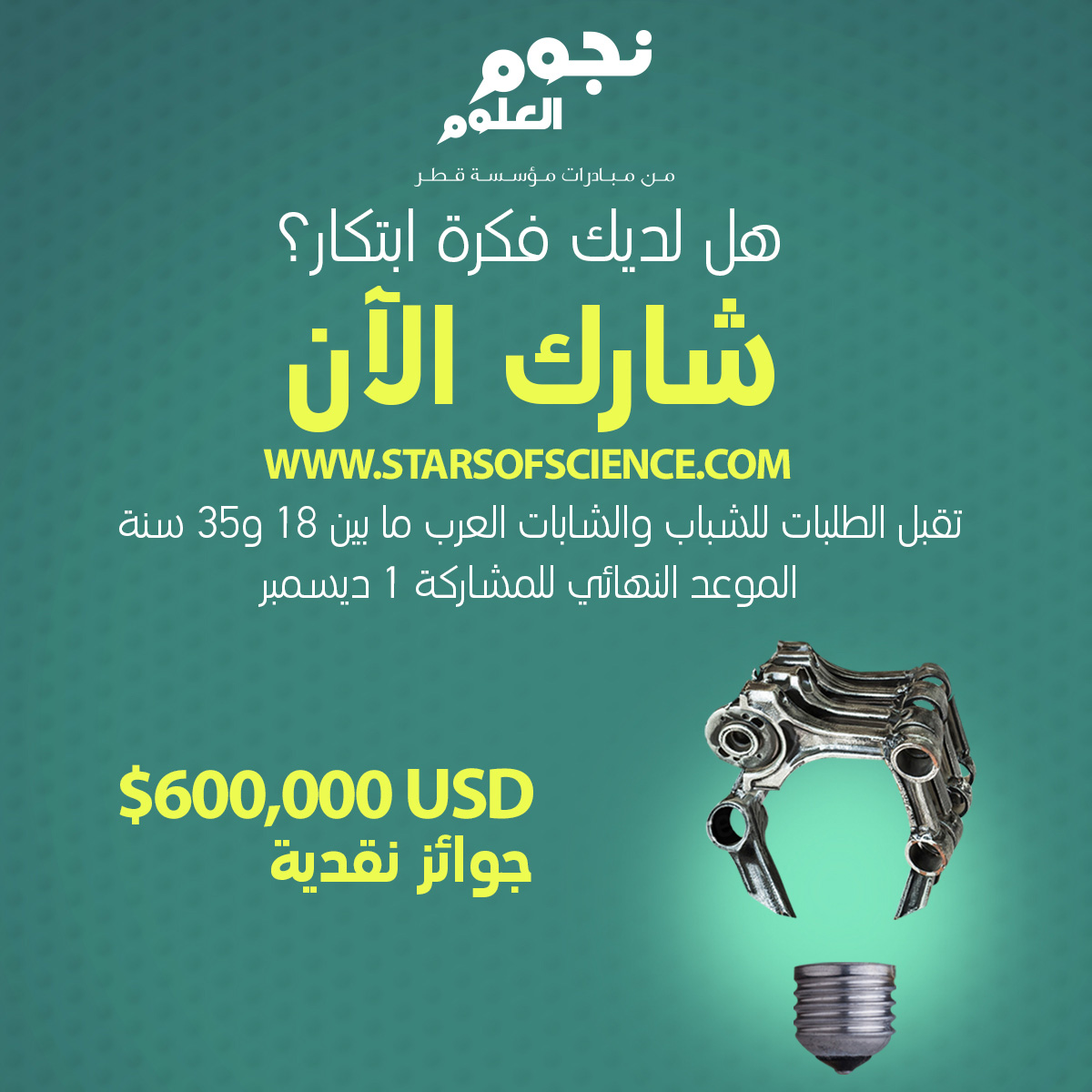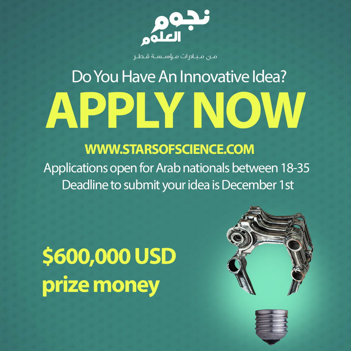 Applications for season 9 are now open for Arab nationals between the ages of 18-35. Please visit www.starsofscience.com for more details.