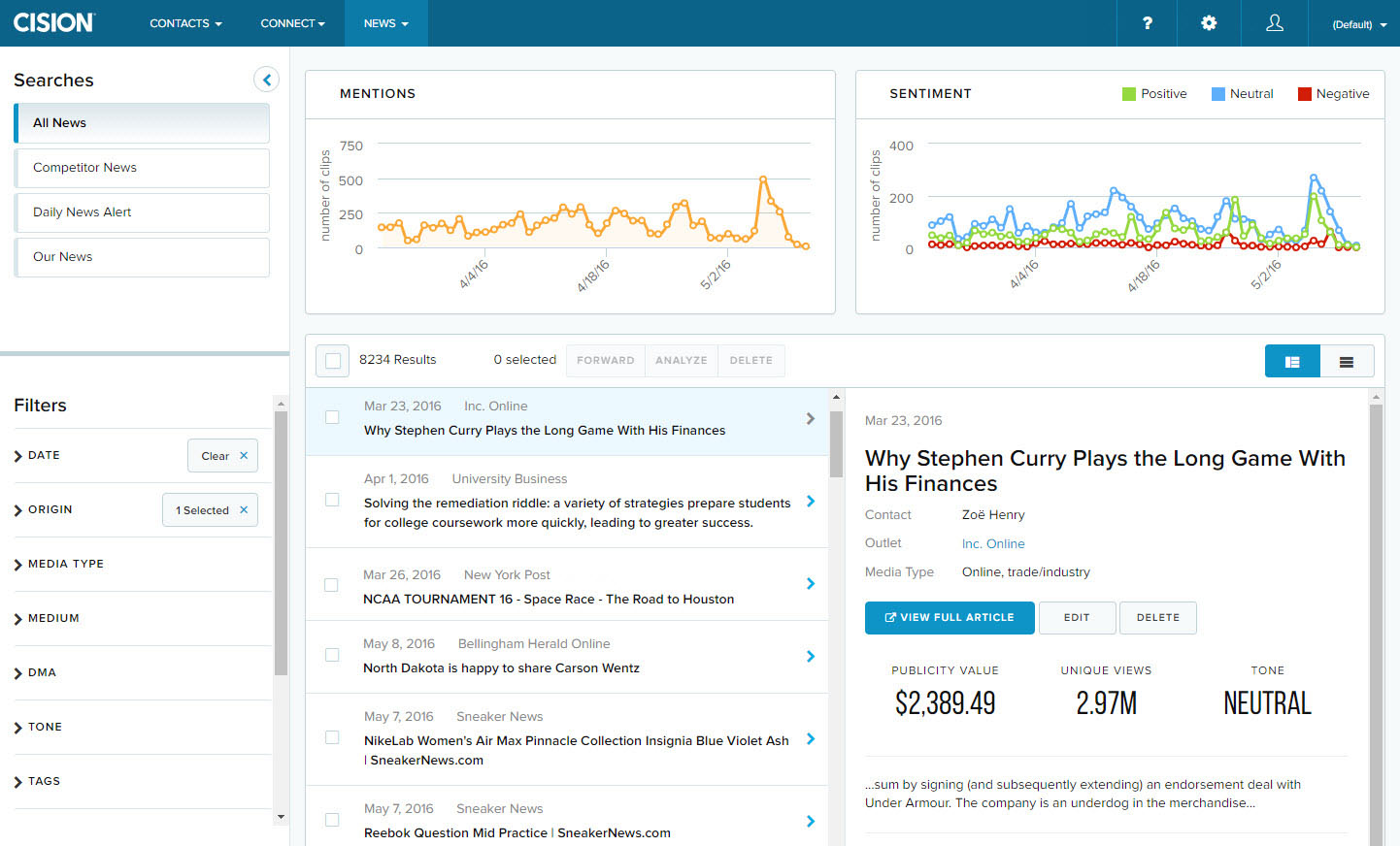 The Cision Communication Cloud focuses not only on the execution of communication strategies, but also on usability and functionality based on extensive user feedback. Its next-generation user interface gives communicators superior control and intuitively anticipates the way communications professionals work. Quick searching, fluid navigation and stunning analytical visualisations maximise effectiveness.