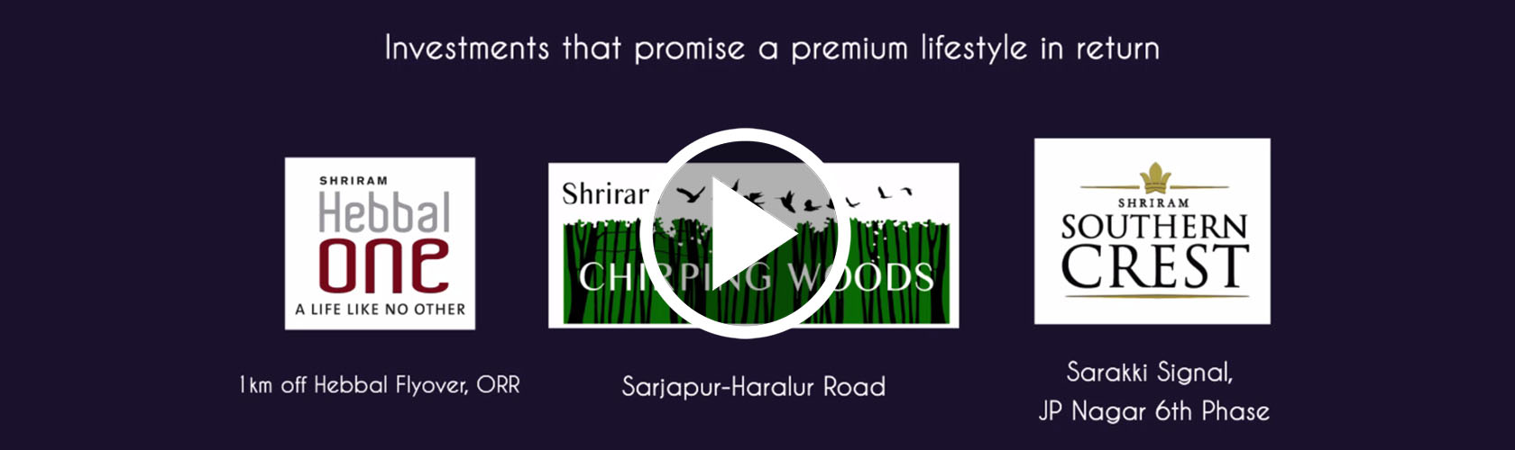 Bengaluru, the IT capital of India is the city of choice for many professionals & entrepreneurs as it home to the best multinational companies, offers a truly cosmopolitan culture & has a pleasant weather, setting it apart from other Indian cities. In this thriving and vibrant city, Shriram Properties offers a signature line of projects like Shriram Hebbal One in Hebbal, the growth corridor of Bengaluru, Shriram Chirping Woods, Off Sarjapur road, a project surrounded by lakes and set in a 16 acre development of which 11 acres is green open space and Shriram Southern Crest in the heart of South Bengaluru, right next to the Sarakki signal. All the 3 projects offer an unparalleled lifestyle with best-in-class amenities, finishes and well planned spaces to cater to the discerning needs of global Indian citizens. Interested customers can click here to book a site visit for these projects.