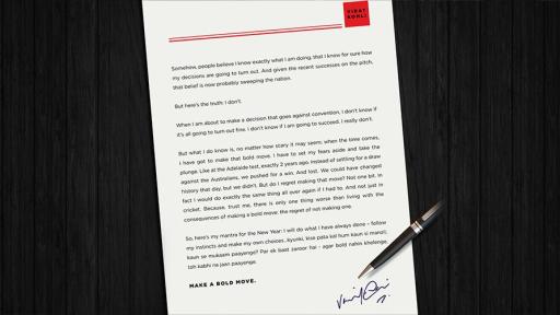 The campaign was launched with an open letter by Virat Kohli where he encourages people to be bold and fearless by saying, “kise pata kal hum kaun si manzil, kaun se mukaam paayenge? Par ek baat zaroor hai - agar bold nahin khelenge, toh kabhi na jaan paayenge”.