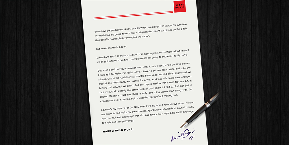 The campaign was launched with an open letter by Virat Kohli where he encourages people to be bold and fearless by saying, “kise pata kal hum kaun si manzil, kaun se mukaam paayenge? Par ek baat zaroor hai - agar bold nahin khelenge, toh kabhi na jaan paayenge”.