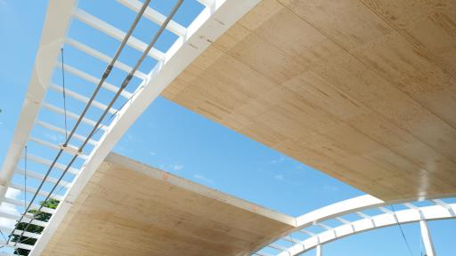 Wooden Kerto LVL elements support the long spans of a steel bowstring truss