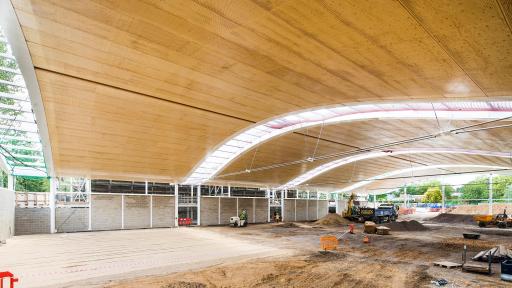 The Kerto LVL elements constitute the vaulted roof construction are 12.9 metres long and have a total height of 645 mm and a maximum width of 1,200 mm. To accommodate the curve of the structure, four different widths were determined, totalling 140 prefabricated Kerto LVL elements. The roof elements fit flush with the vaulted, spaced, steel bowstring truss.