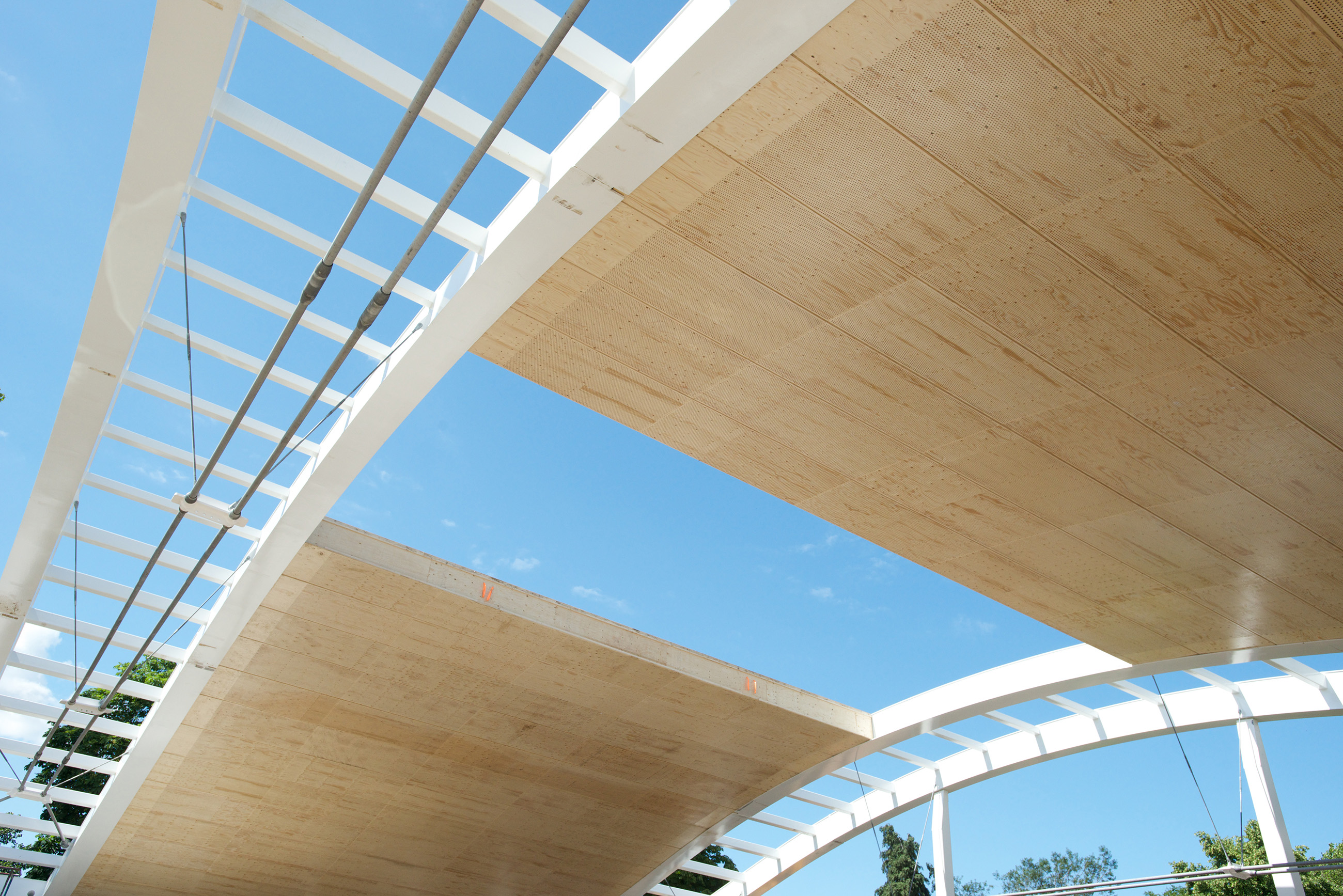 The depth of the Kerto LVL elements determined the depth of the curved steel member, as the steel had to be flush with the elements to accommodate the green roof structure above. The connection detail between the wood and the steel element therefore were very accurately designed. The project team used BIM technology to ensure the steel and the wood elements fitted together “like a hand in a glove”.
