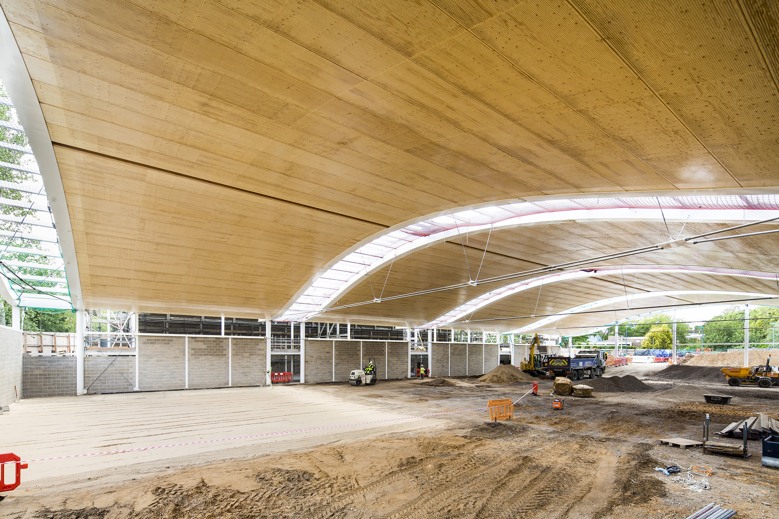 The Hurlingham project in London involved the construction of a sports complex including four indoor tennis courts and four squash courts. The racquet hall, designed by David Morley Architects, is 35 metres wide and 55 metres long. The main span consists of suspended steel beams. To give the courts space and reduce the costs, the beams are spaced with large gaps of 12.9 metres. To fill these gaps, the architect wanted to see wood.