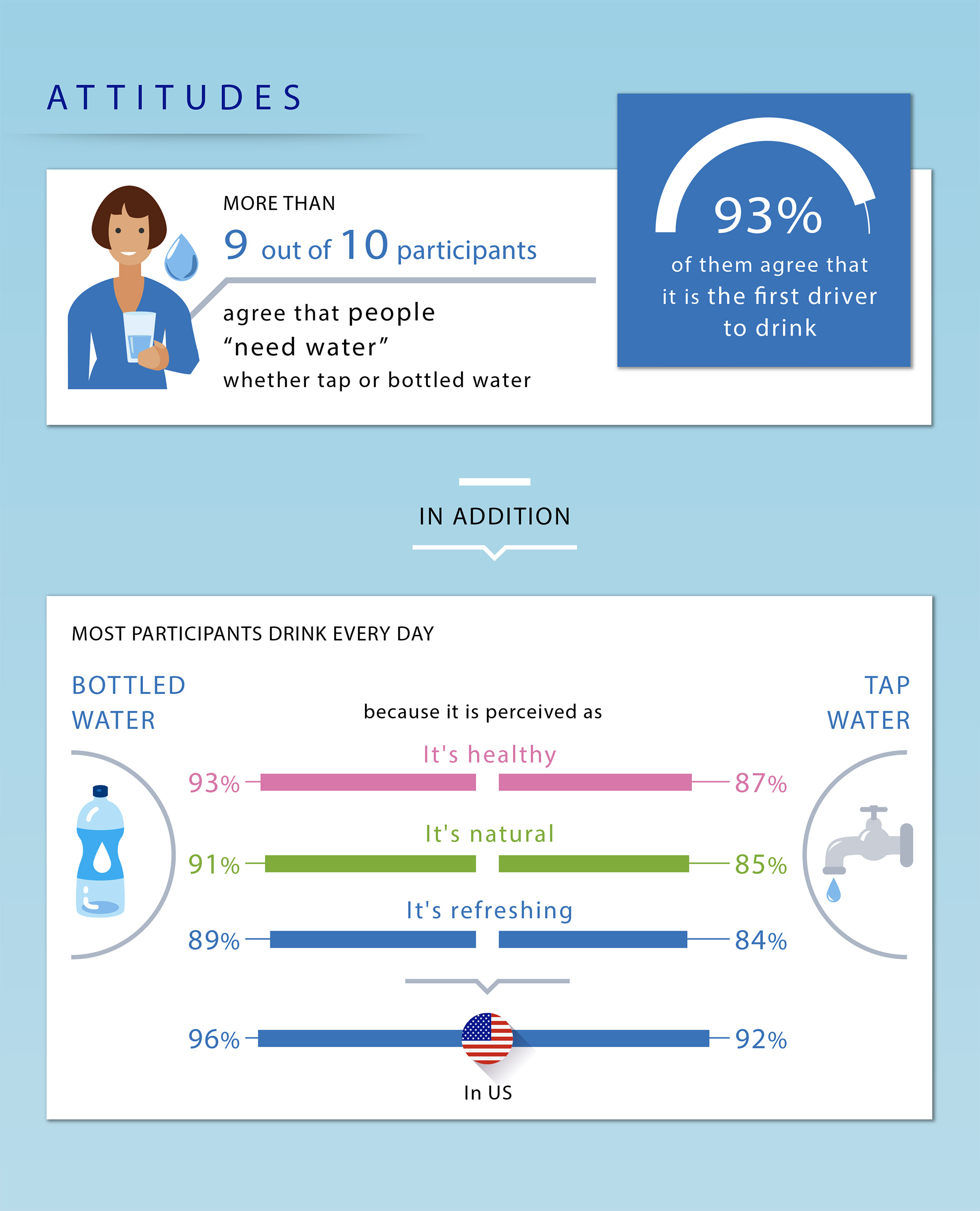 Bottled water is consumed for health and safety reasons (93%), and because it is perceived natural (91%) and refreshing (89%); convenience is the main reason highlighted by tap water drinkers (88%).