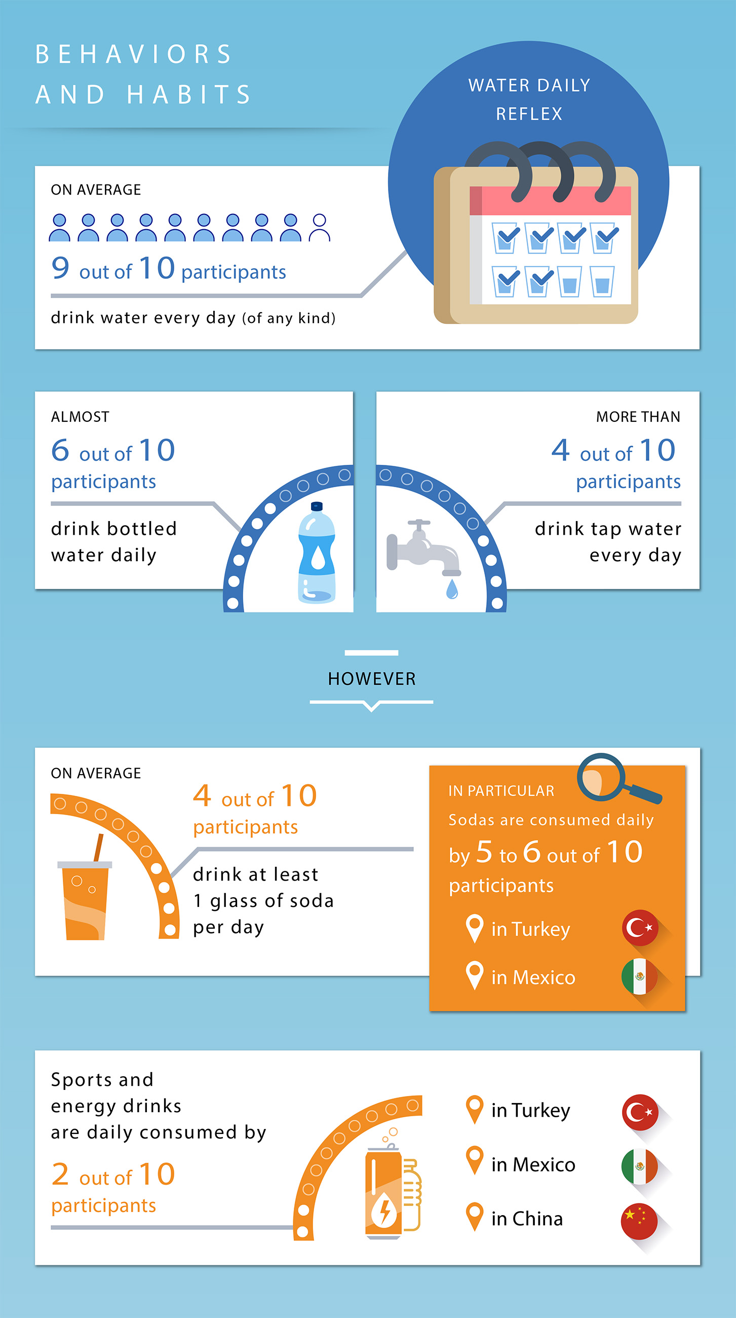 Regarding the other types of drinks consumed daily, 4 out of 10 participants drink at least 1 glass of soda per day on average, and sodas are consumed daily by 5 to 6 participants out of 10 in Turkey and Mexico. Sports and energy drinks are consumed daily by 1 out of 5 participants in Mexico, Turkey and China.