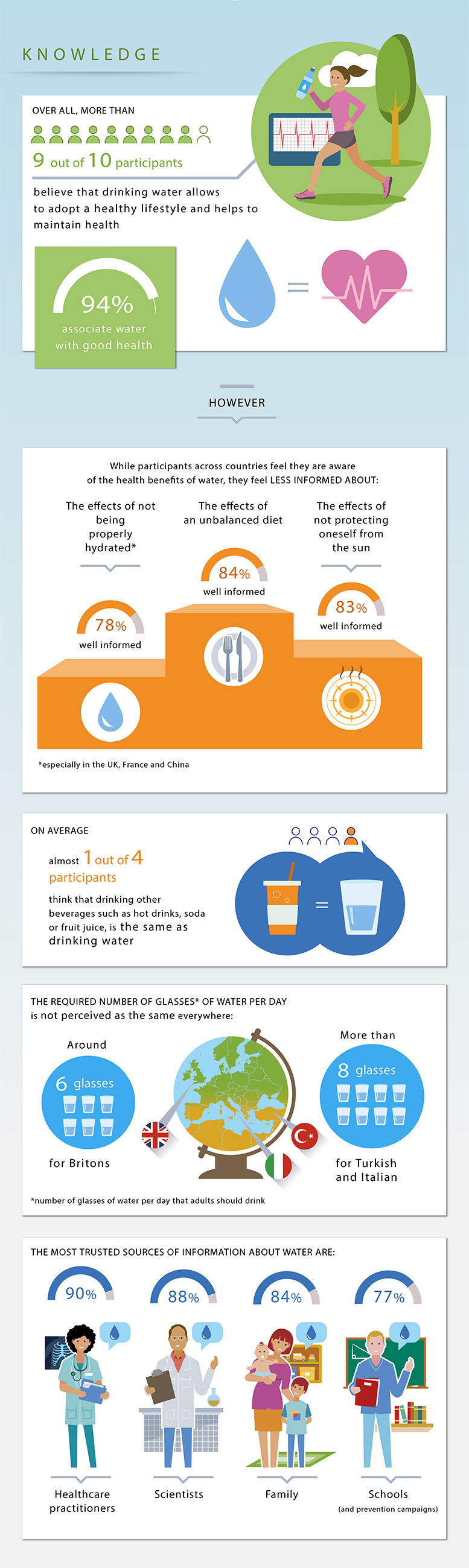 Nevertheless, the participants feel less informed about the damaging effects of inadequate hydration (78% well informed) compared to those of an unbalanced diet (84% well informed), especially in the UK, France and China, and unprotected exposure to the sun (83%).