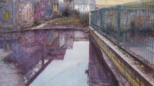 Her winning work, Dead End, is one of a series of gritty cityscape works that document in fine detail the abandoned urban spaces, spaces that normally escape our awareness, as the periphery, the fringes, where cities become blurred.