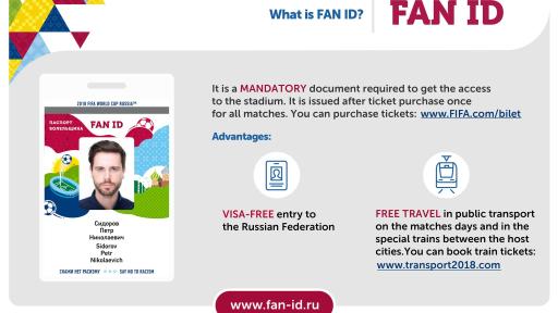 A FAN ID will entitle foreign citizens and stateless persons to visa-free entry to the Russian Federation. Also FAN ID will entitle its holder to free travel on the special trains connecting the host cities of the 2018 FIFA World Cup™ and on public transportation in the host cities on match days.