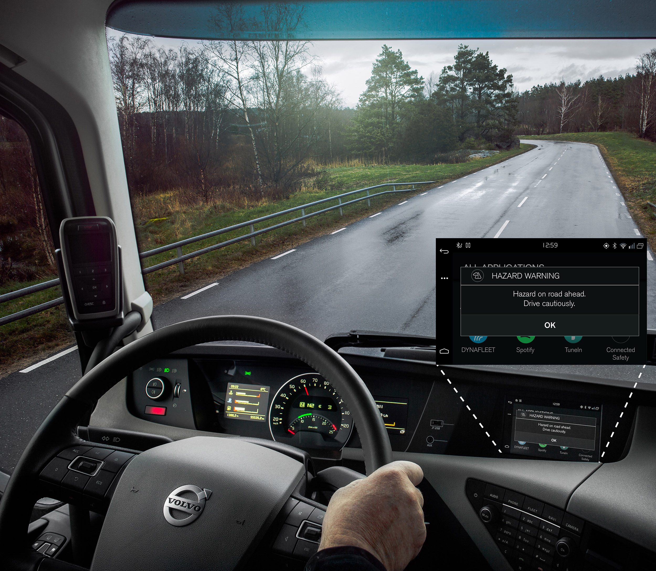 - Here’s how Connected Safety works: When the hazard warning lights are switched on, the truck sends a signal via the driver’s Internet-connected mobile phone to Volvo Trucks’ cloud service. From there the information is forwarded to the corresponding service at Volvo Cars. An alert is then transmitted to all connected cars and trucks approaching the location of the vehicle whose hazard lights have been activated.