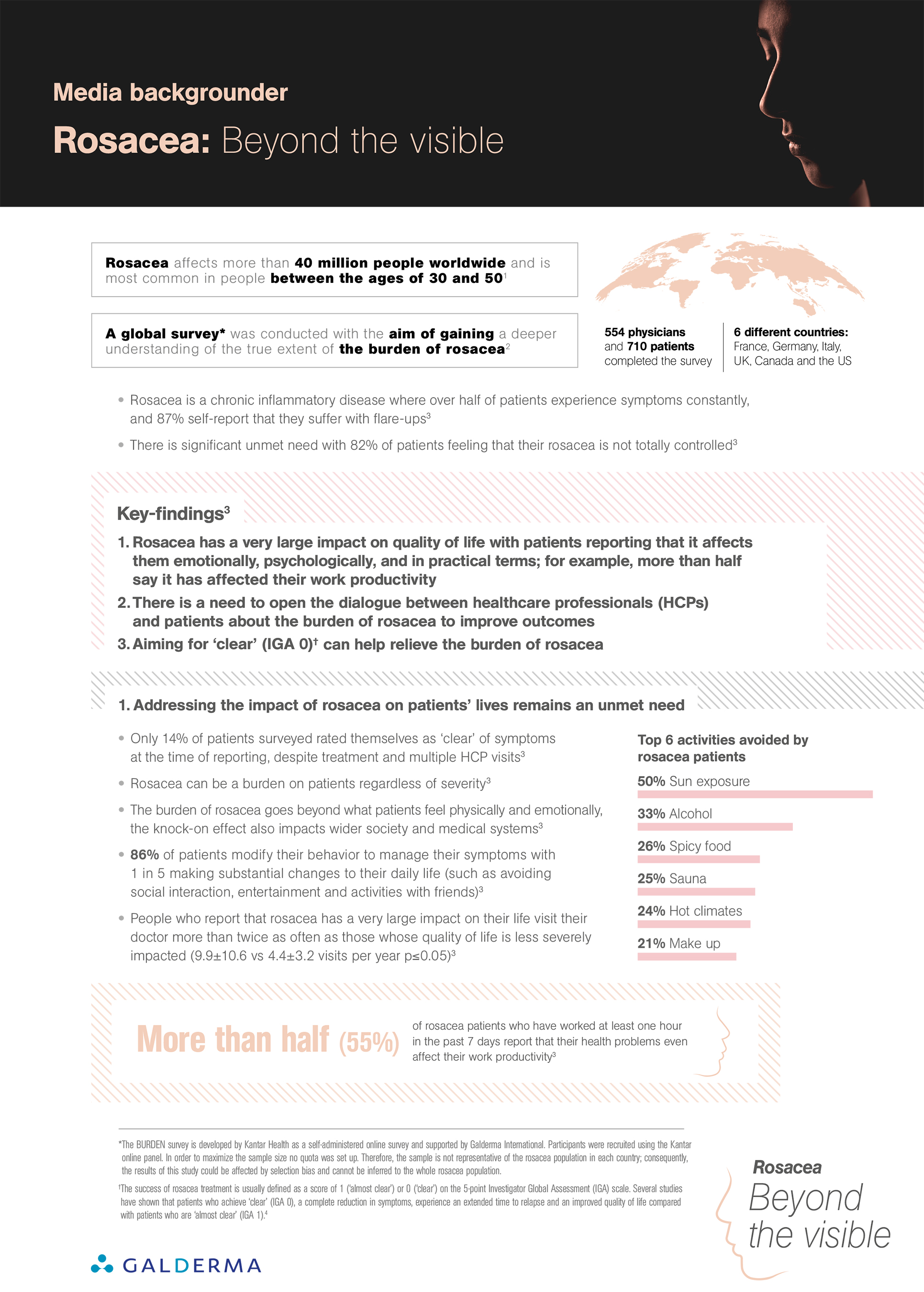 The BURDEN survey was developed by Kantar Health as a self-administered online survey and supported by Galderma. Participants were recruited using the Kantar online panel. To maximize the sample size no quota was set up. Therefore, the sample is not representative of the rosacea population of each country; consequently, the results of this study could be affected by selection bias and cannot be inferred to the whole rosacea population. Rosacea: Beyond the visible was developed under the direction and sponsorship of Galderma International, survey was conducted by Kantar Health with writing support provided by Emma Waring, Havas Life Medicom.