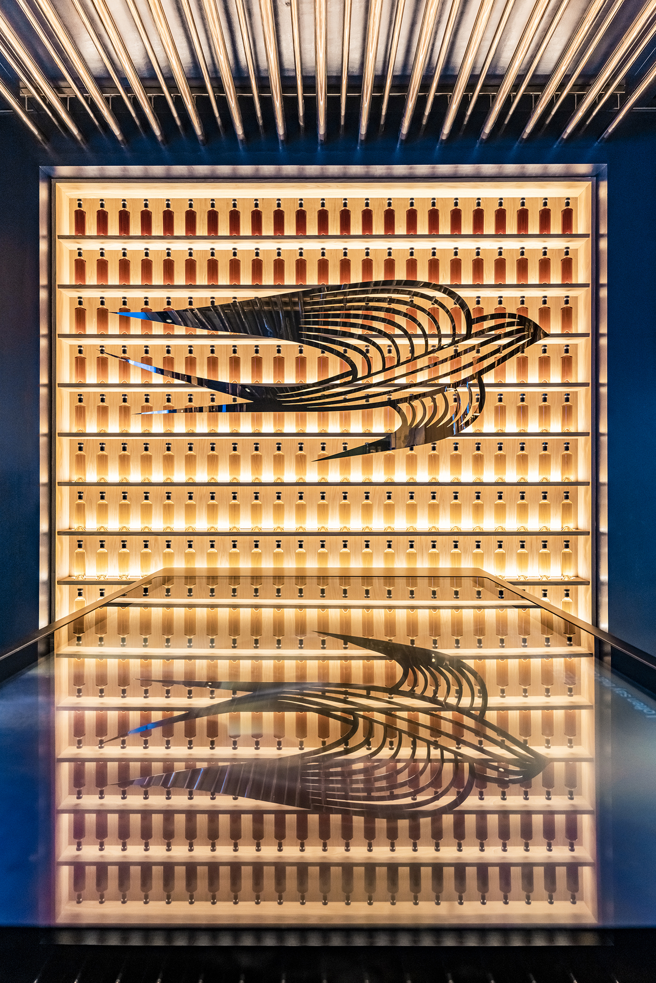 True to the spirit of generosity for which Maison Martell is renowned, L’Atelier Martell welcomes visitors in a warm and luxurious ambiance featuring authentic elements directly from Cognac. Its name derives from the French word for a craftsman’s workshop, and its design was inspired by the Atelier of the Martell Cellar Master – notably the spectacular display of more than 200 montres (glass sampling bottles), which showcases the myriad nuances of cognac. Elsewhere, a wall of oak barrels from the Martell cooperage and selected pieces from the archives illustrate the House’s heritage of craftsmanship. These are complemented by materials such as wood and copper, evoking the cognac-making process, which are interpreted in original, contemporary ways to show how Maison Martell boldly transforms tradition.