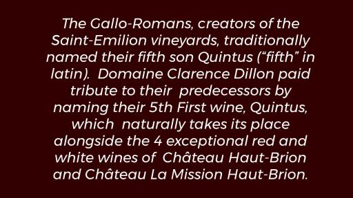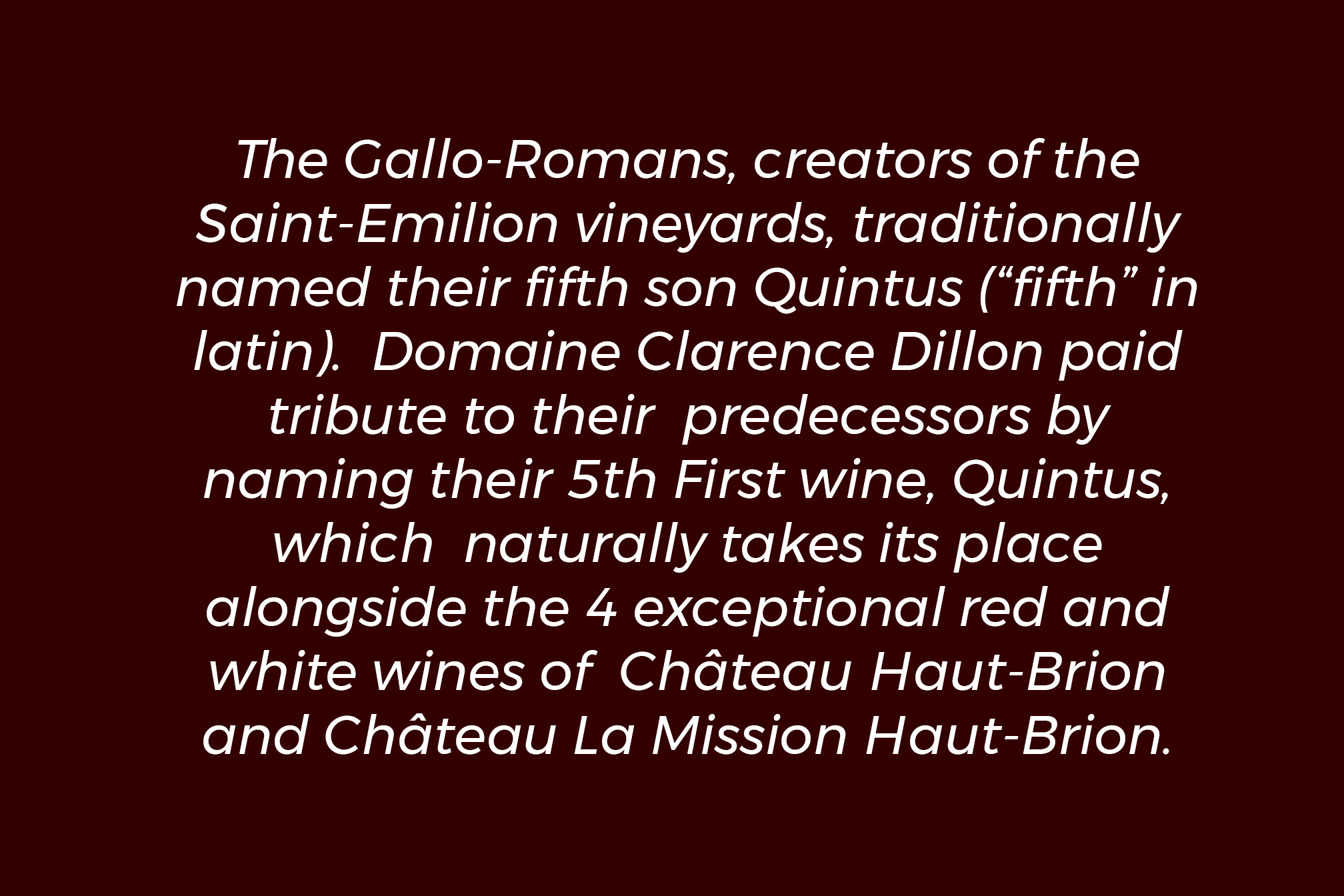 The history of Quintus is closely linked to that of Saint-Emilion, one of the oldest winegrowing areas of the region. Perched on a limestone promontory, culminating at an altitude of 62 metres, Quintus offers up a breath-taking 360-degree view across the Dordogne valley. Its topography, boasting a plateau and featuring north, west and south facing slopes, comprises an incredible abundance of micro-climates and limestone soils, especially well suited for extricating the finest qualities of the Merlot and Cabernet Franc grape varietals.