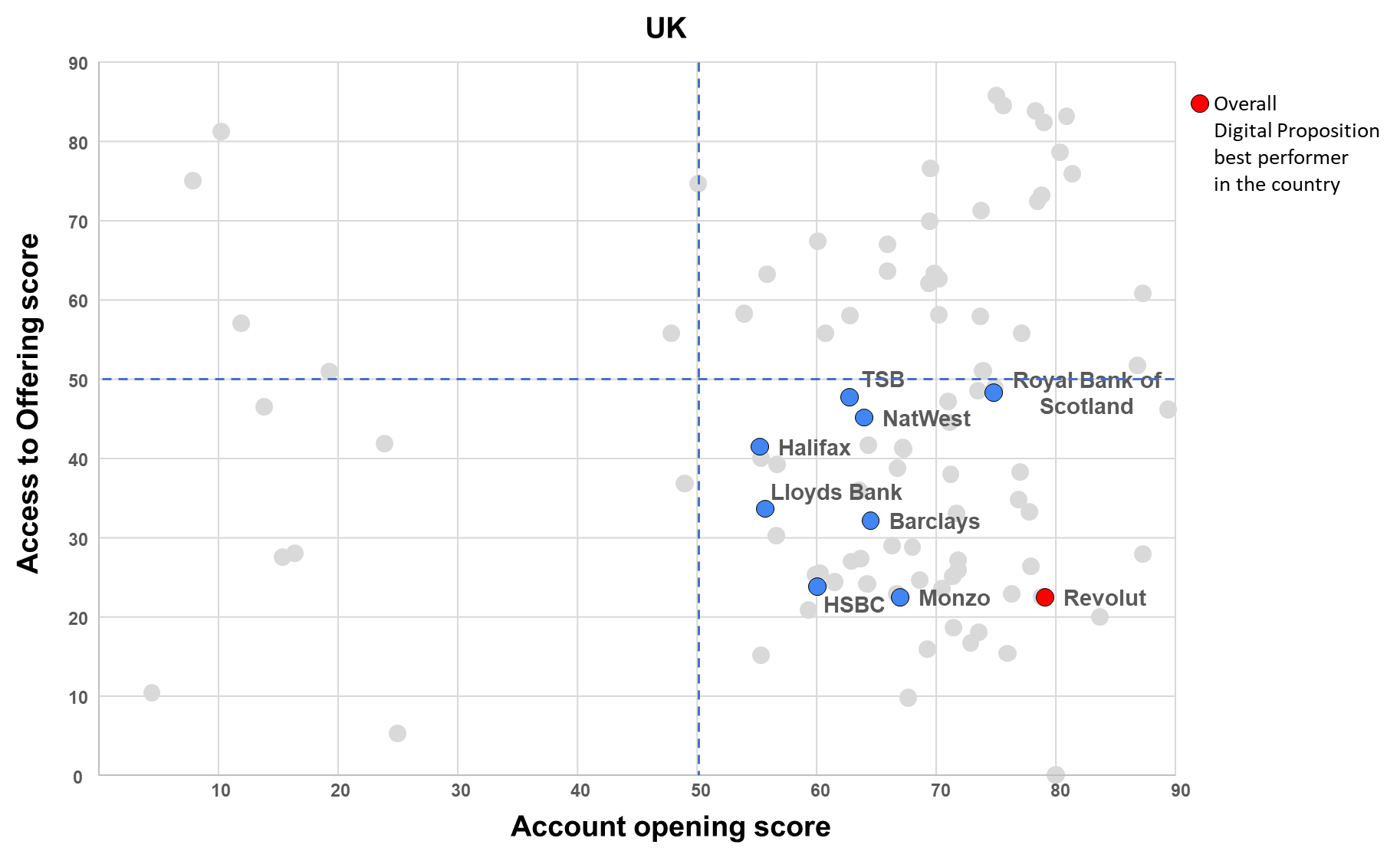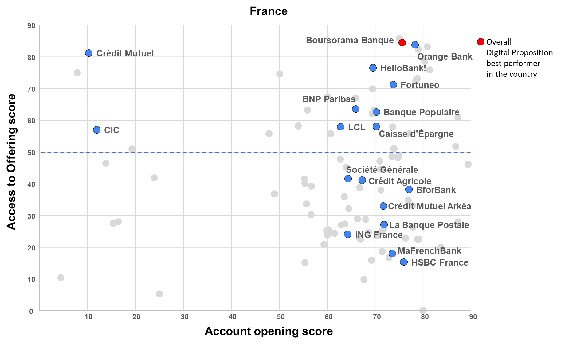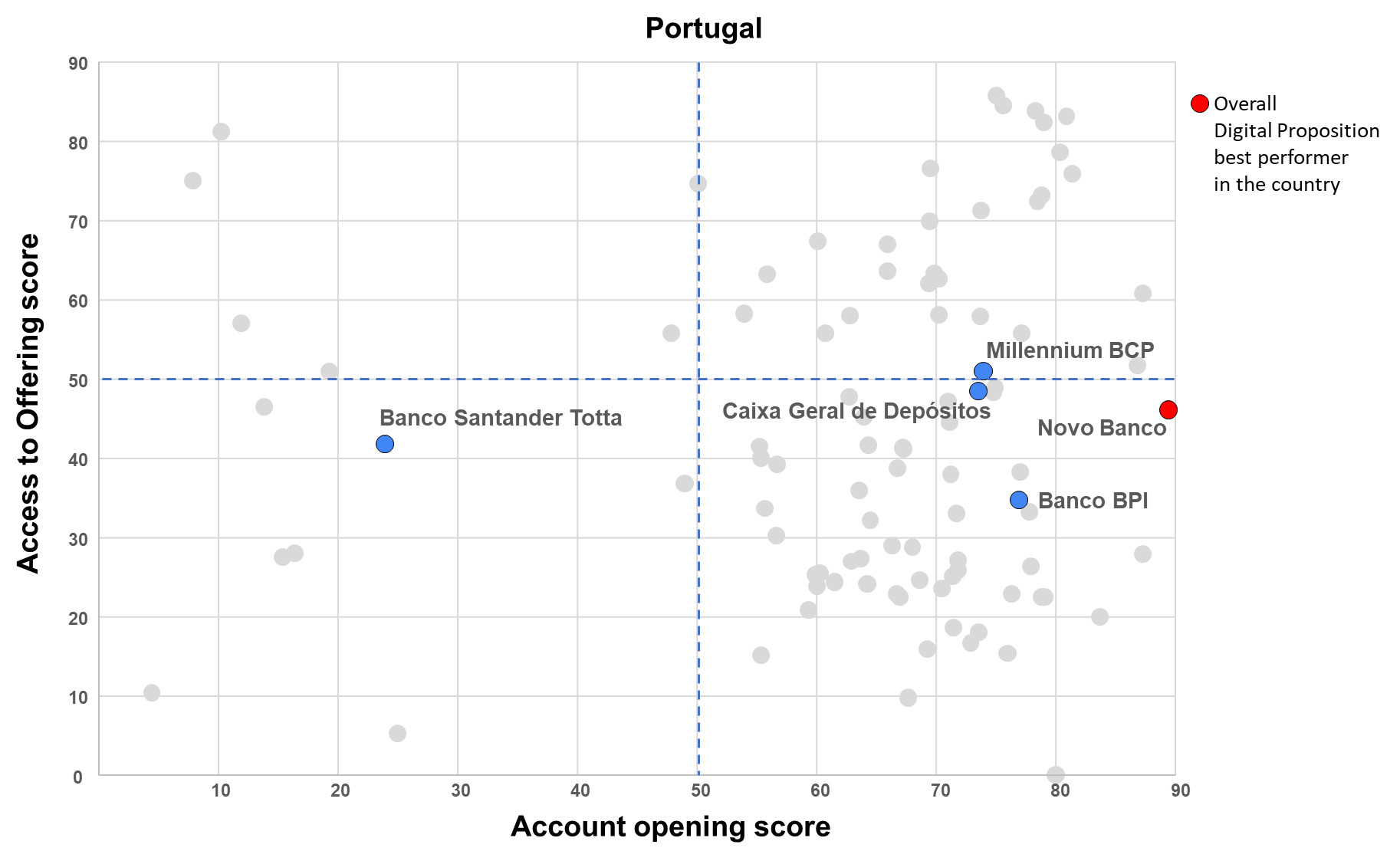 Ultimately, the Digital Proposition’s assessment positions the various players based on their performance in terms of attraction (account opening score) and products digital offering (access to offering score).