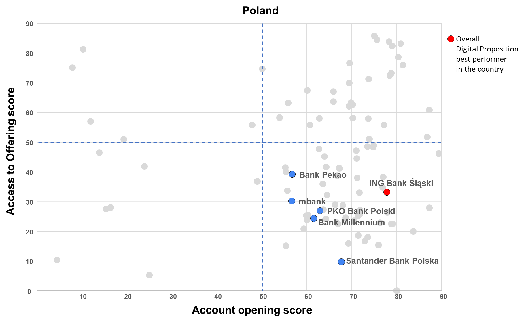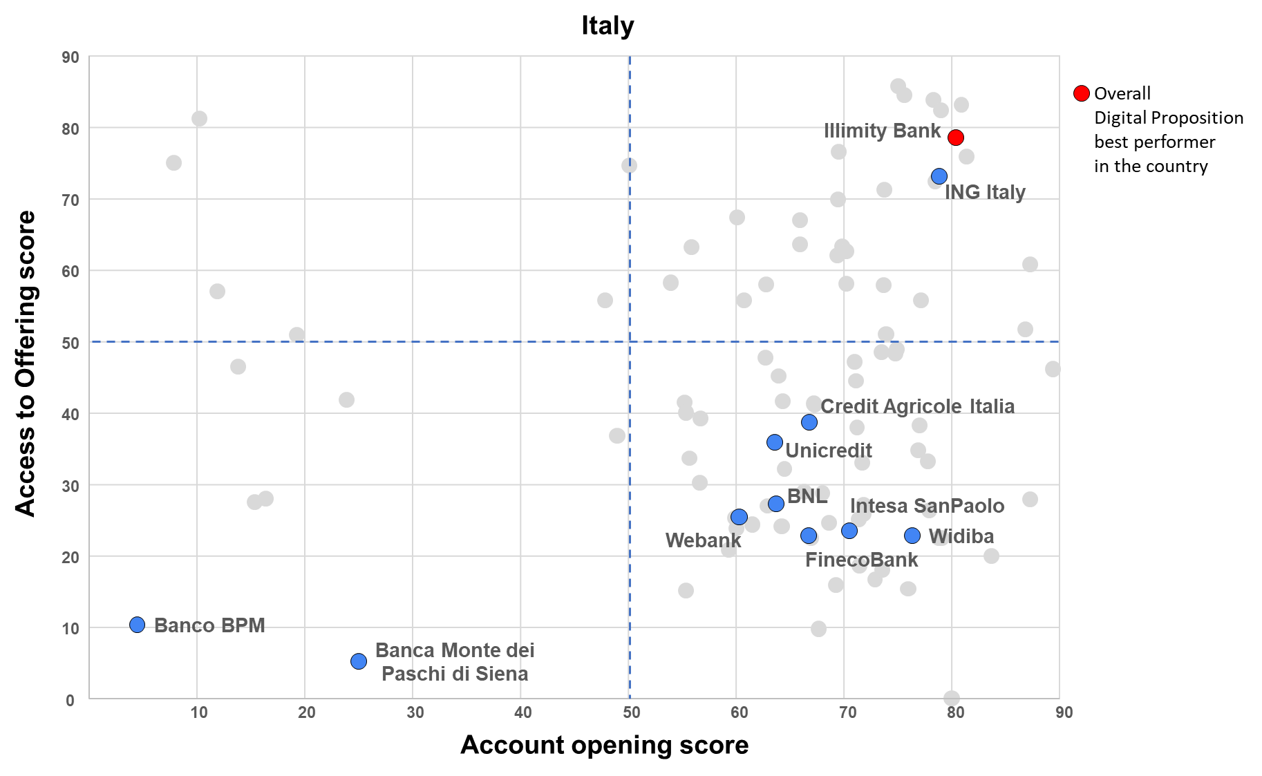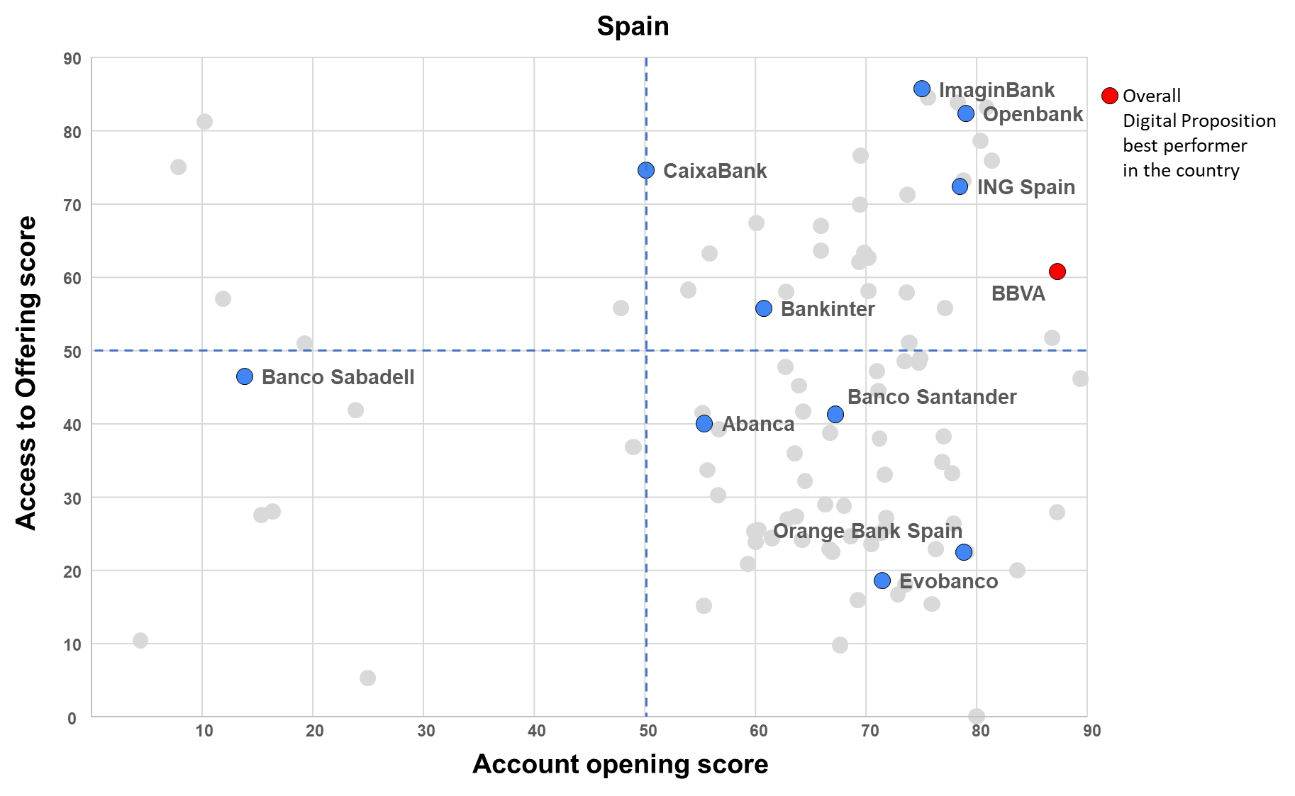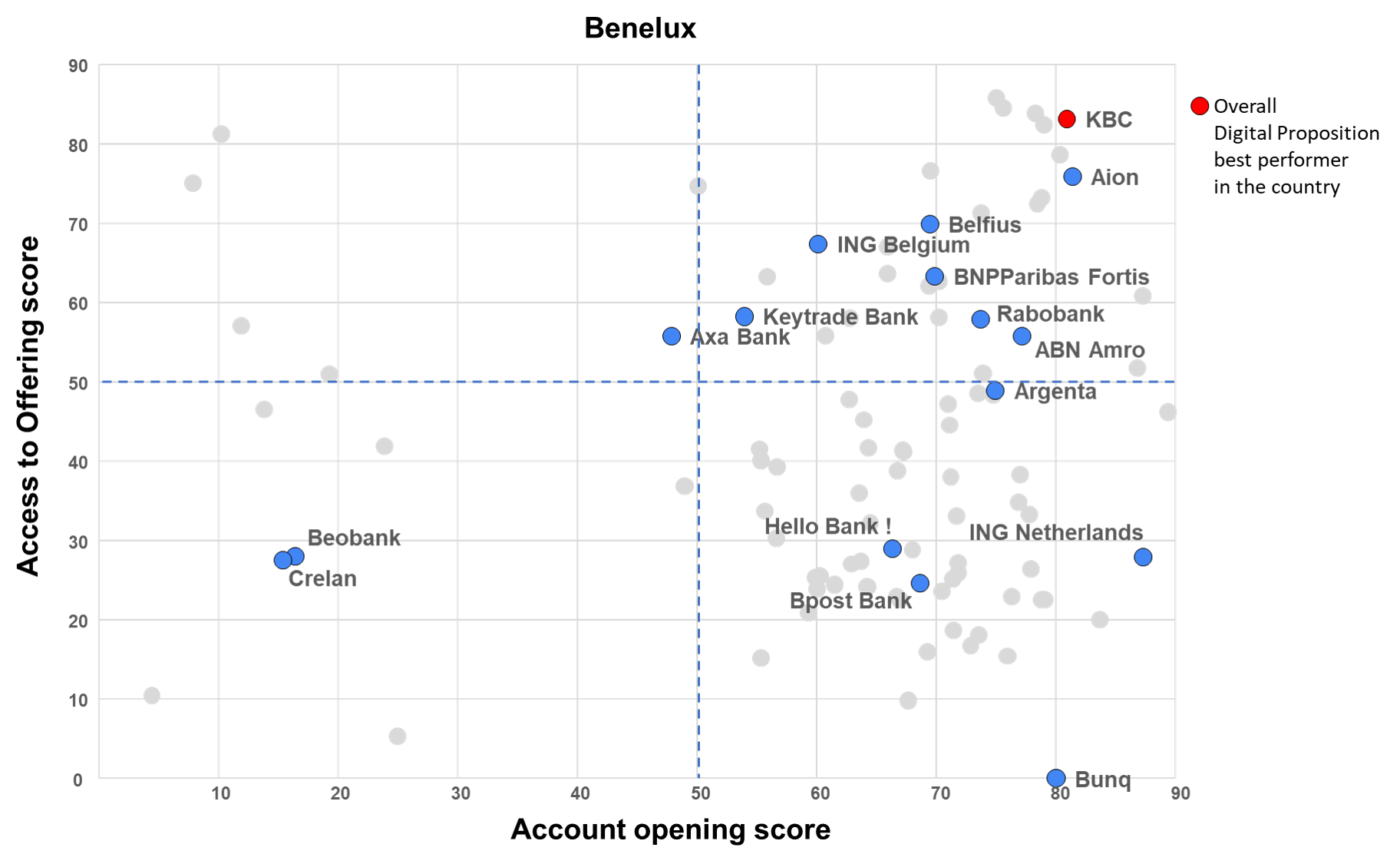 Ultimately, the Digital Proposition’s assessment positions the various players based on their performance in terms of attraction (account opening score) and products digital offering (access to offering score).