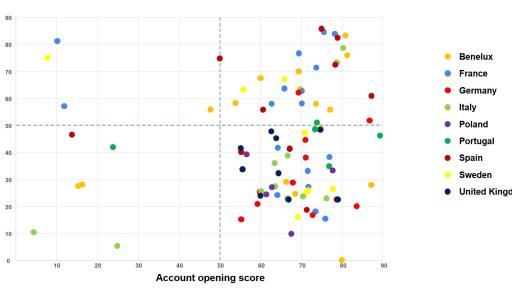 In addition, as mobile apps fast becoming the main link between customers and their banks, the former can now open their accounts through said apps at 48% of the banks assessed (in Poland and Benelux, in particular). Some players, like KBC or Intesa Sanpaolo, even allow potential customers to try out the mobile app with an account linked to another bank before making the switch.
