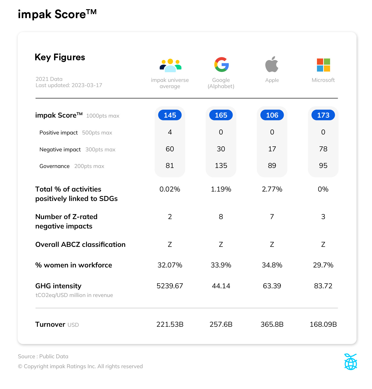 March 30, 2023 — impak Analytics is proud to present an impact analysis of the three largest tech companies in the world in 2022.