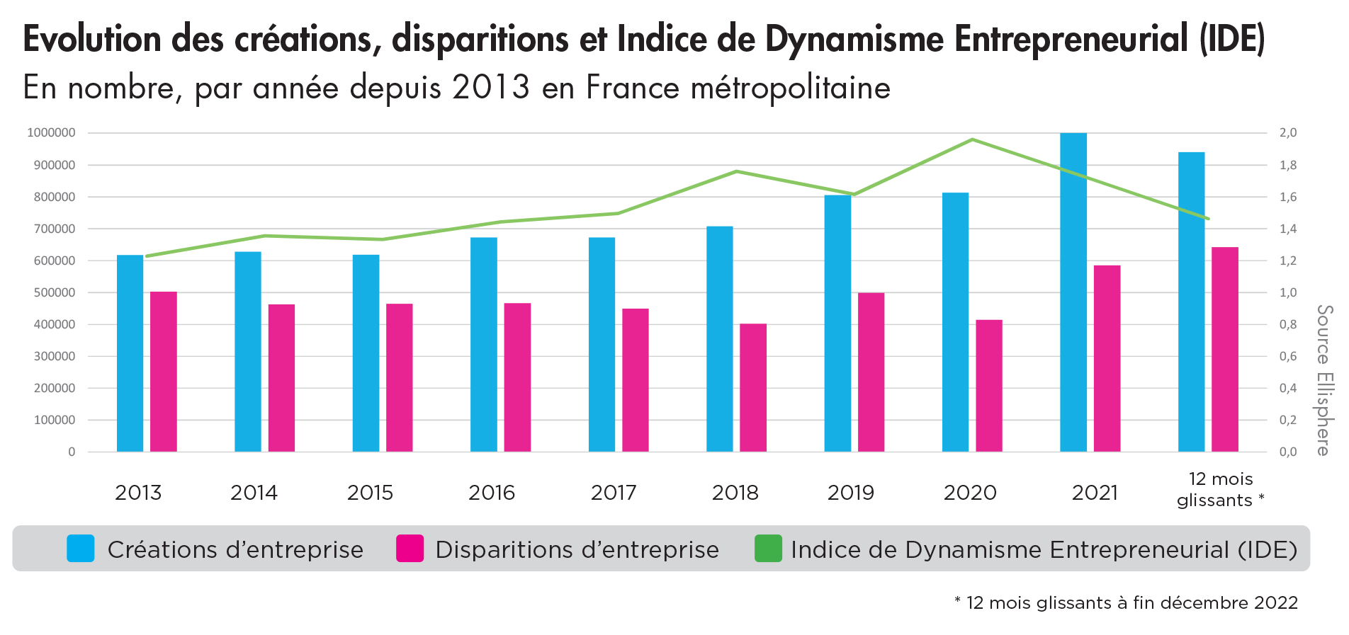 In metropolitan France, in the year 2022, 1.5 entities were created for every 1 company that disappeared. In 2021, the entrepreneurial dynamism index (EDI) was 1.7 creations and in 2020, 2 creations for 1 disappearance! A drop in dynamism is essentially due to a strong increase in the number of business closures. Indeed, only 5.8% of disappearances are the result of a judicial liquidation, still below the 10% or more before the Covid-19 crisis.