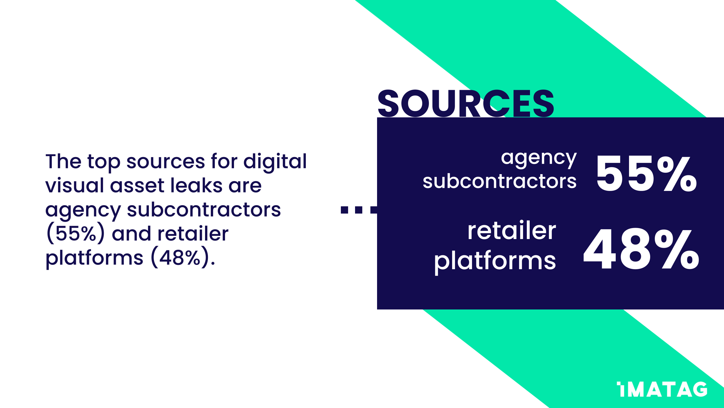 The top sources for digital asset leaks are agency subcontractors and retailer platforms. Other sources are lack of protection on mobile devices and office equipment, lost phones/laptops with non-protected images, and staff members sharing content with third parties outside the company (not realizing the material was confidential).