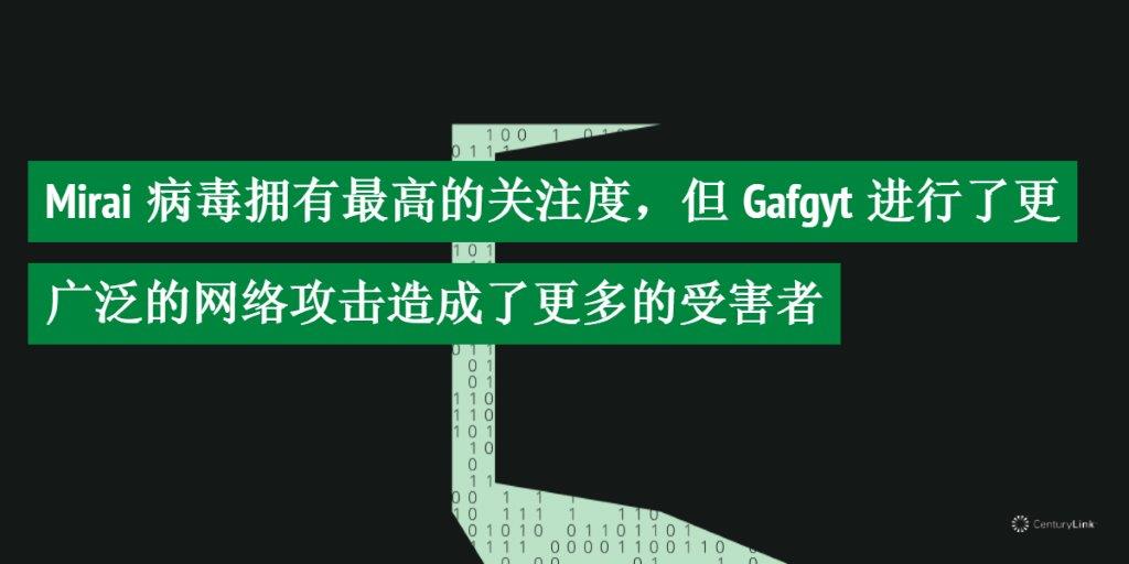 - Mirai病毒及其变种一直是新闻报道的重点,但在2017年,CenturyLink威胁研究实验室发现了影响着更多受害者的Gafgyt攻击,其攻击持续时间也更长。