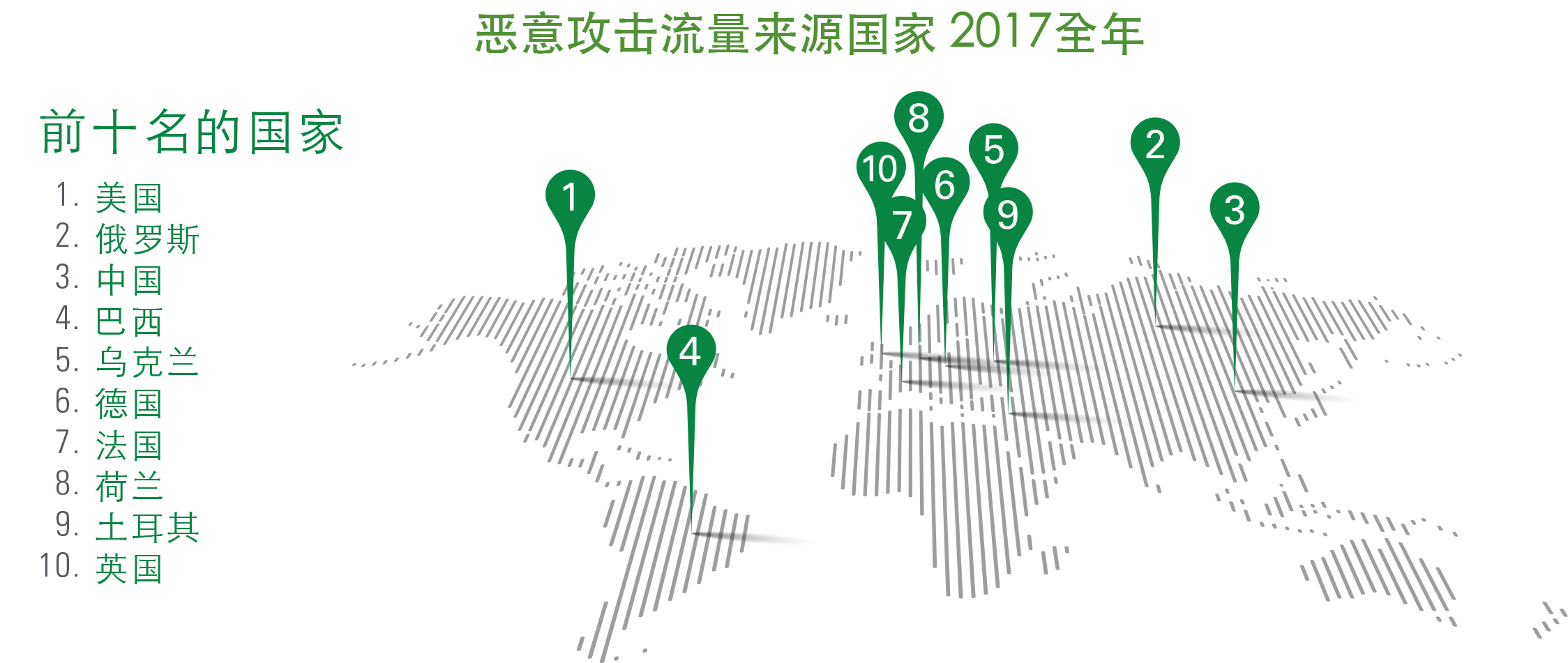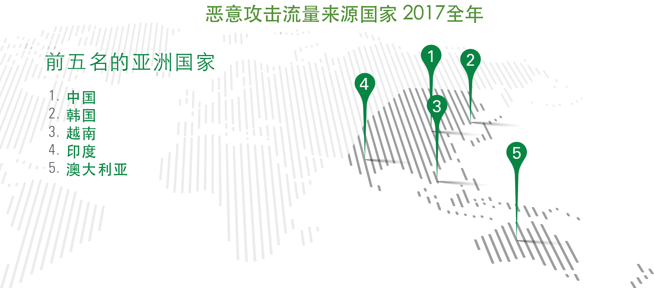 - 按2017年全球恶意网络通信量来算,亚太区排名前五的国家和地区是中国大陆、韩国、日本、印度和香港。