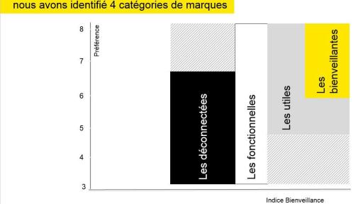 En corrélant ces 2 indices (préférence et bienveillance), on peut distinguer, 4 types de marques :