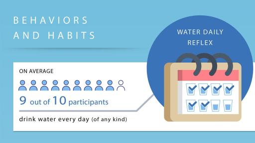 Ninety-six percent of people report consuming water all day long on multiple occasions (after sports, while commuting, during meals at home or at a restaurant). Though occasions for drinking water are spread throughout the day, there are habits specific to each country.