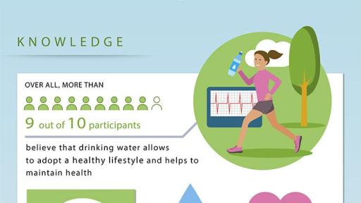 Survey respondents feel that drinking water allows to adopt a healthy lifestyle and to maintain one’s health (94% for both). The respondents believe in water’s benefits to internal body functions: in average, the two main benefits put forward are the actions of water to flush out toxins and to aid in the digestion process even if these actions have not been scientifically demonstrated.