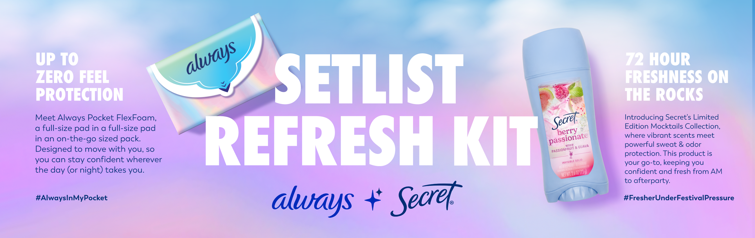 Always, the #1 OBGYN recommended period care brand, and Secret, the #1 women’s deodorant brand*, identified a shared consumer need at festivals: discomfort, worry, and lack of confidence tied to bathroom experiences. By partnering at Coachella, the brands are providing a real solution designed specifically for women in high-energy, real-life festival environments, addressing both functional needs like period protection, sweat, and odor, and emotional confidence.